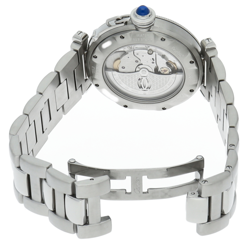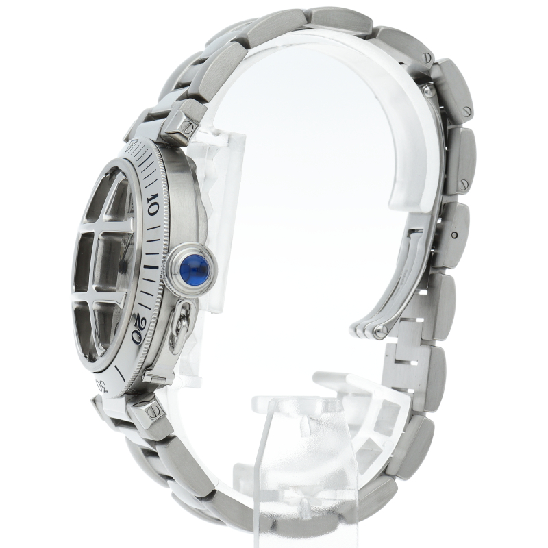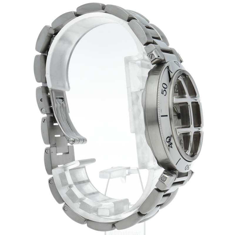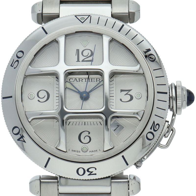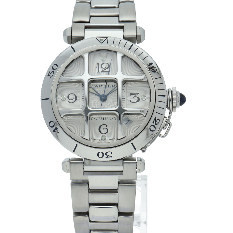 カルティエの人気シリーズ「パシャ」。グリッドを使用したインパクトあるデザインが特徴的な1本。グリッドは取り外し可能でシンプルなフェイスにも変更可能です。