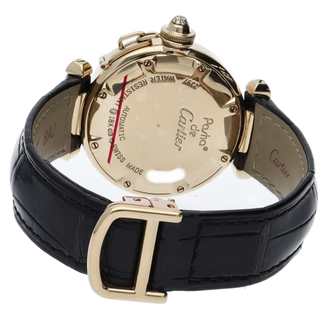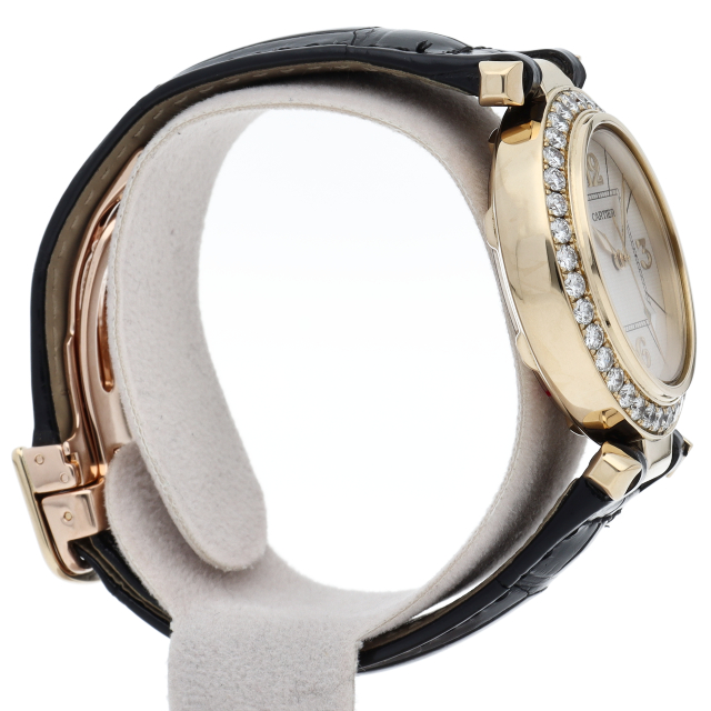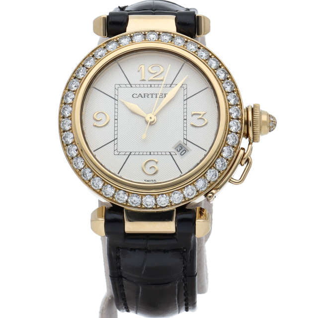 カルティエウォッチの中でも特に人気の高い「パシャ コレクション」。32ミリのケースにはイエローゴールドを使用し、ベゼルに贅沢にあしらわれたダイヤモンドが目を引く一本です。