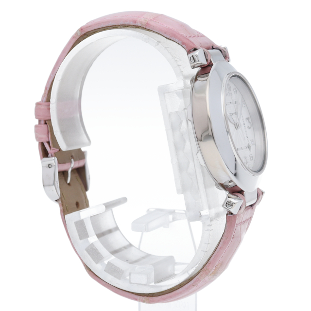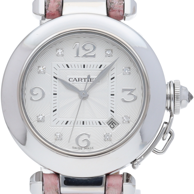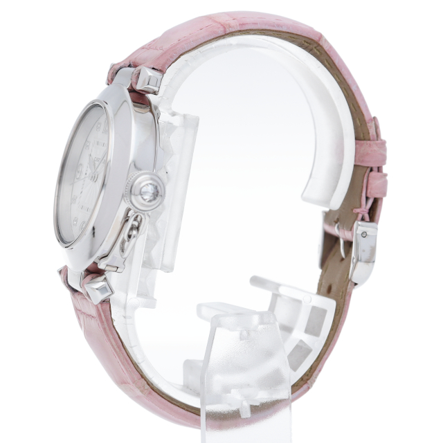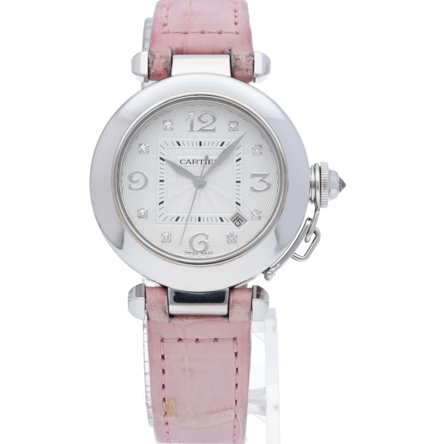現在では生産終了となってしまったパシャ32mmの自動巻きモデルです。文字盤インデックスには8Pのダイヤモンドが施されており、より華やかな印象です。カルティエらしいエレガントなデザインの中にも、スポーツモデル独特の力強い雰囲気が魅力的です。