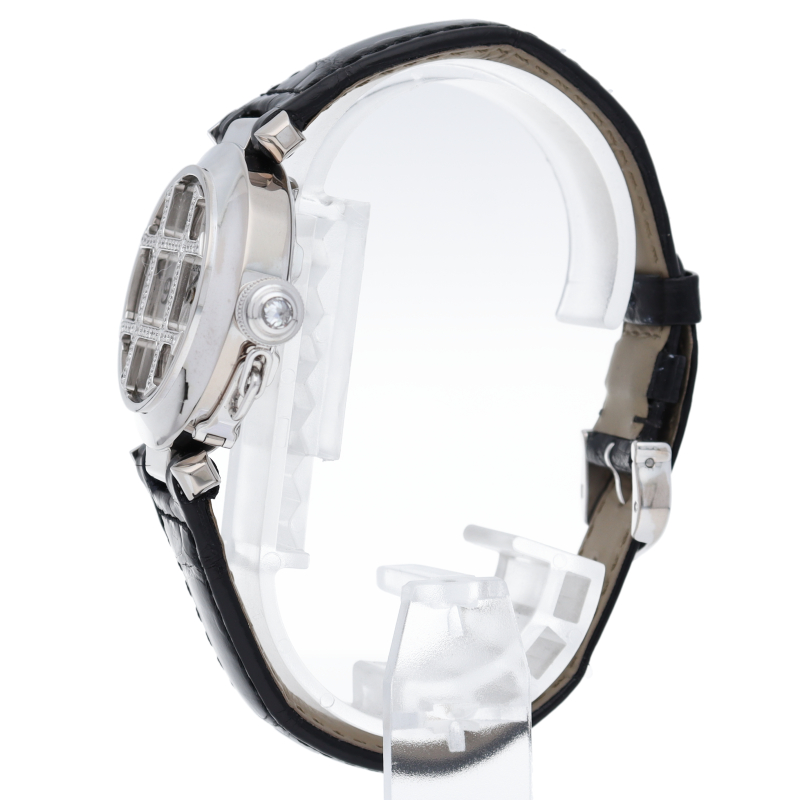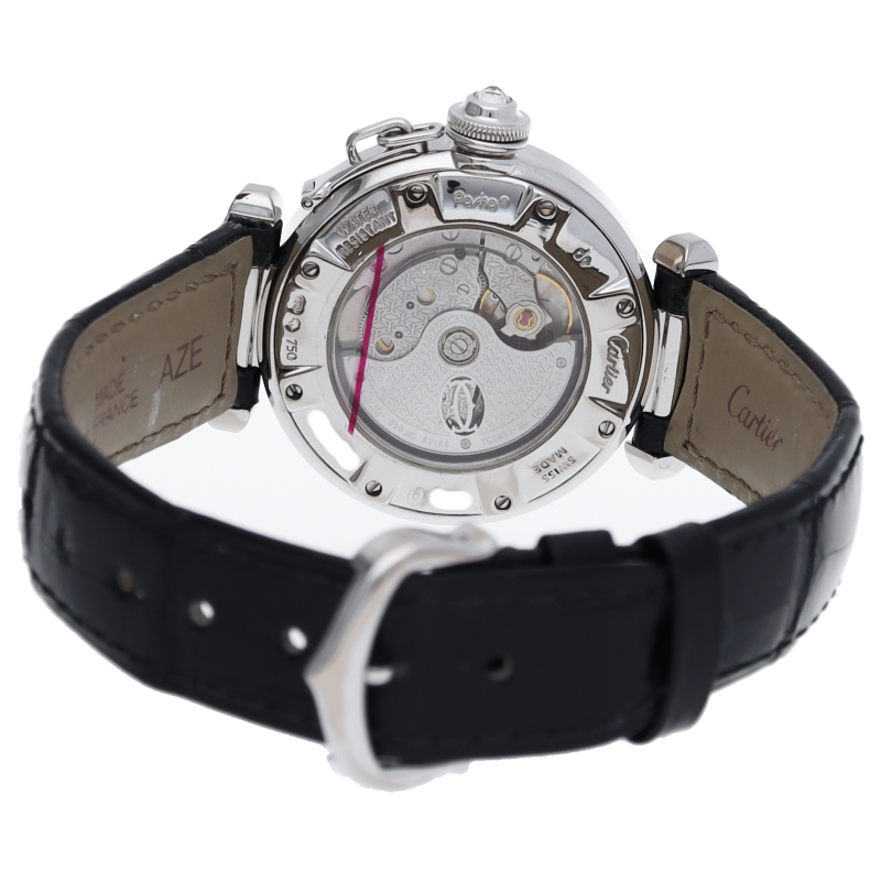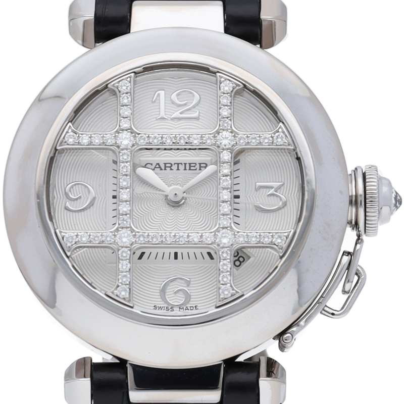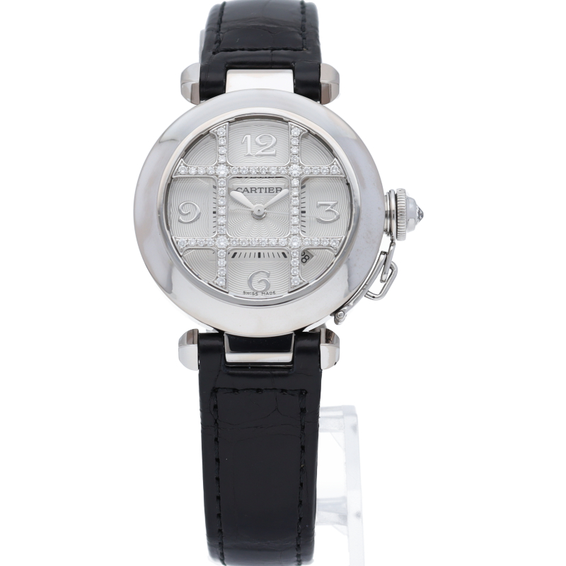 カルティエの人気シリーズ「パシャ」。素材はホワイトゴールドでグリッドはダイヤがあしらわれて抜群の存在感を感じ取れます。グリッドは取り外し可能でシンプルなフェイスにも変更可能です。