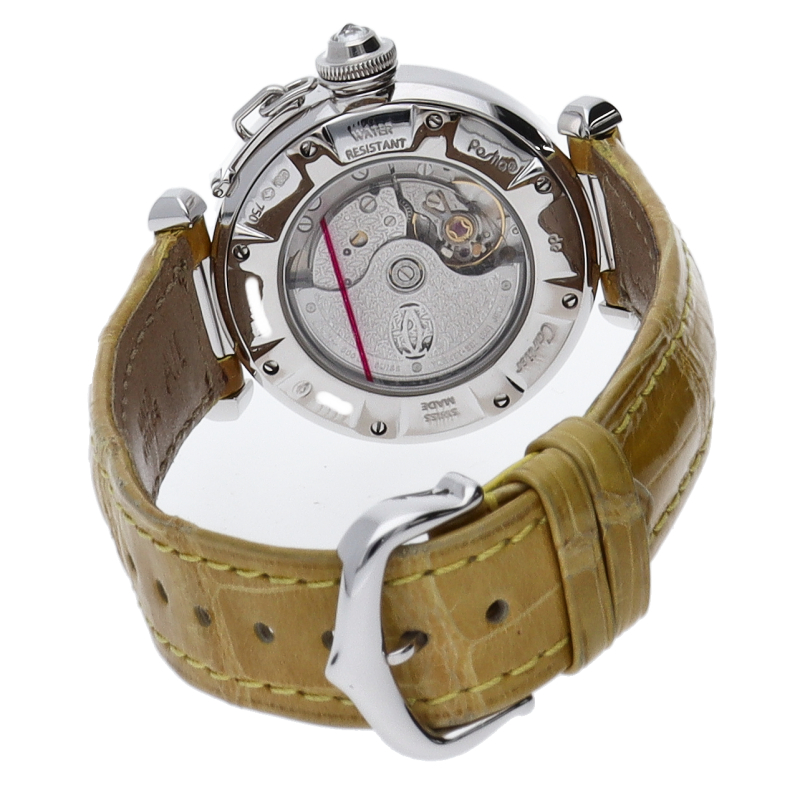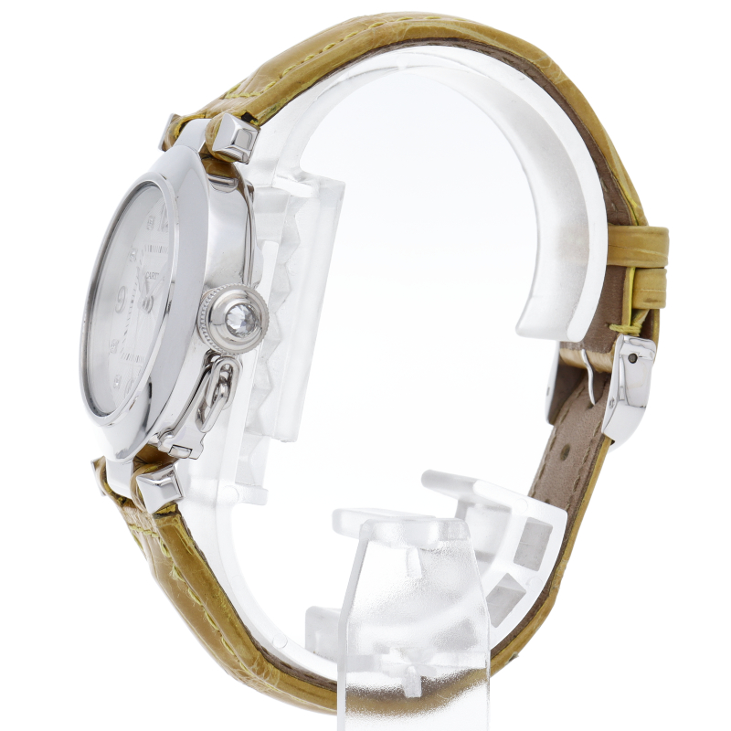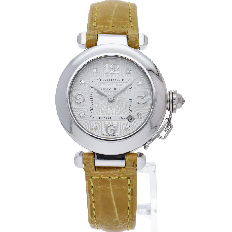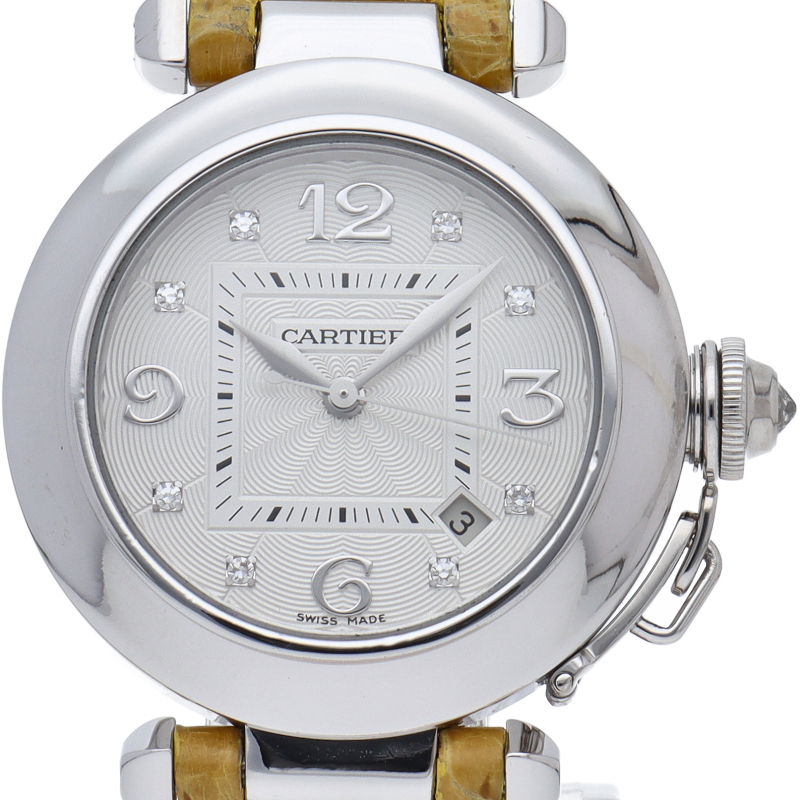 現在では生産終了となってしまったパシャ32mmの自動巻きモデルです。文字盤インデックスには8Pのダイヤモンドが施されており、より華やかな印象です。カルティエらしいエレガントなデザインの中にも、スポーツモデル独特の力強い雰囲気が魅力的です。