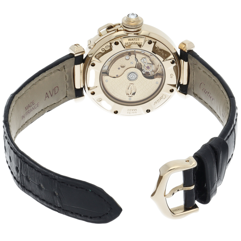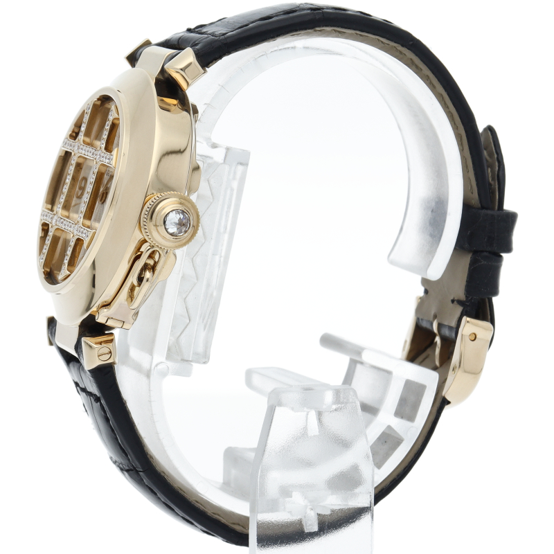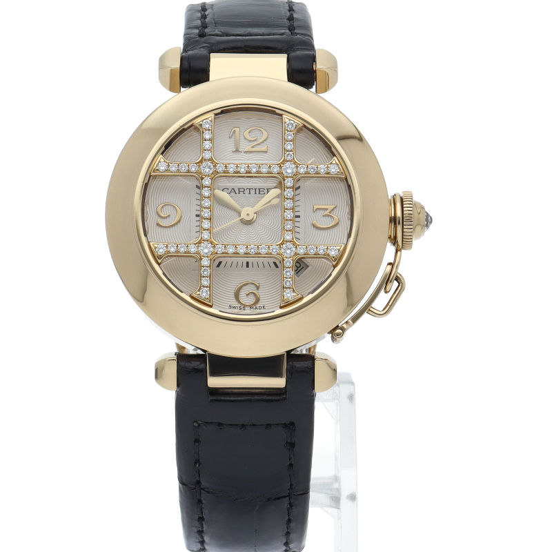 カルティエの人気シリーズ「パシャ」。素材はイエローゴールドでグリッドはダイヤがあしらわれて抜群の存在感を感じ取れます。グリッドは取り外し可能でシンプルなフェイスにも変更可能です。