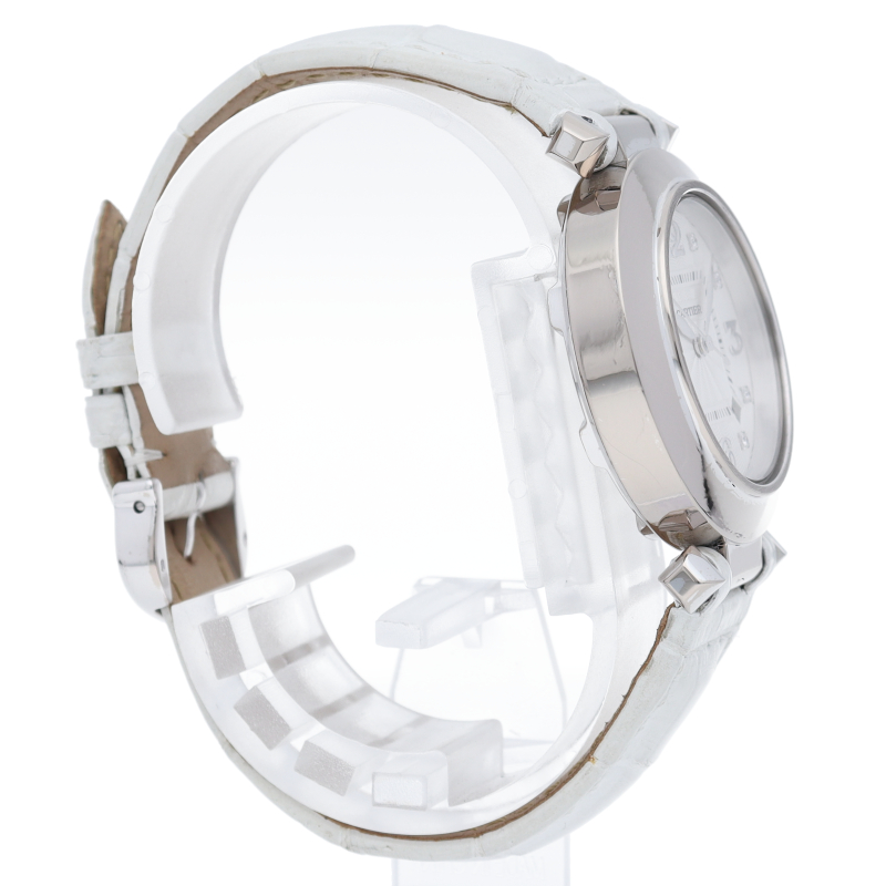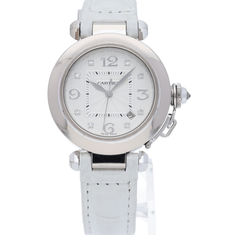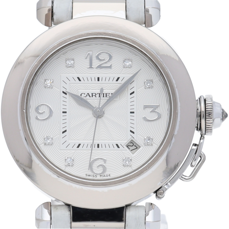 現在では生産終了となってしまったパシャ32mmの自動巻きモデルです。文字盤インデックスには8Pのダイヤモンドが施されており、より華やかな印象です。カルティエらしいエレガントなデザインの中にも、スポーツモデル独特の力強い雰囲気が魅力的です。
