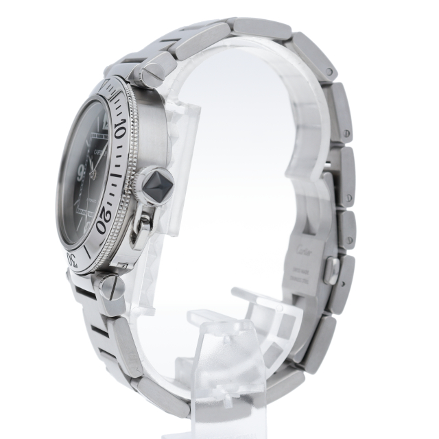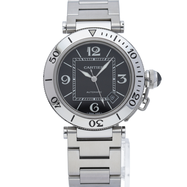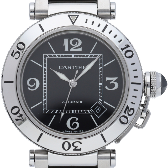 カルティエの人気シリーズ「パシャ」を上品なダイバーズ・ウォッチに仕上げた「シータイマー」。デイト表示,逆回転防止ベゼルと実用性も兼ね備えた1本。