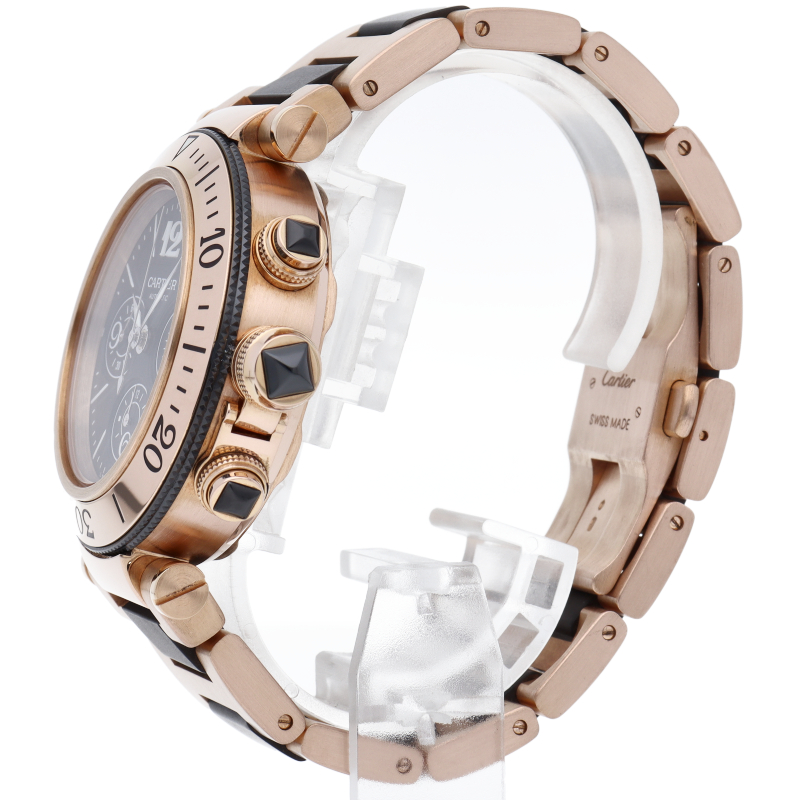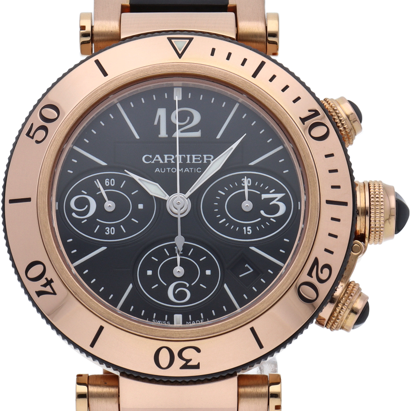 カルティエの人気シリーズ「パシャ」を上品なダイバーズ・ウォッチに仕上げた「シータイマー」。デイト表示,逆回転防止ベゼルと実用性も兼ね備えた1本。