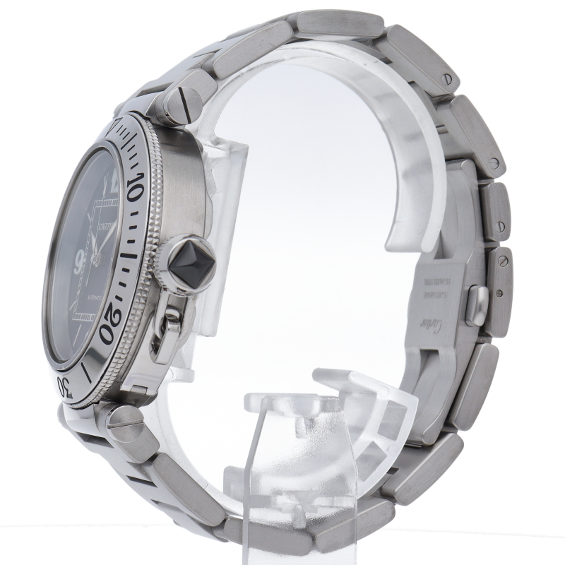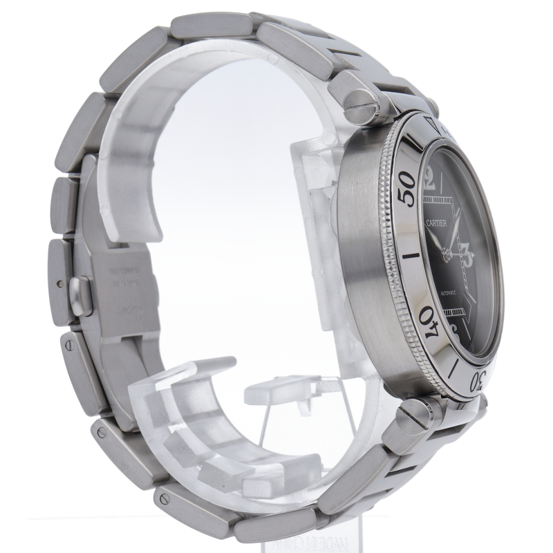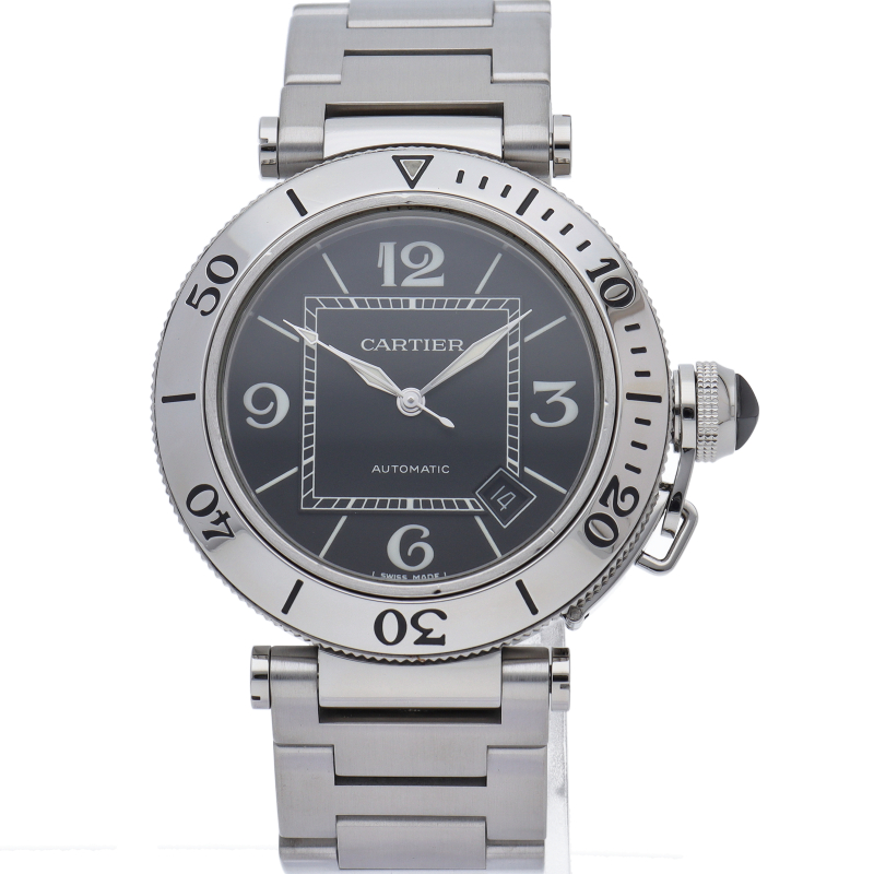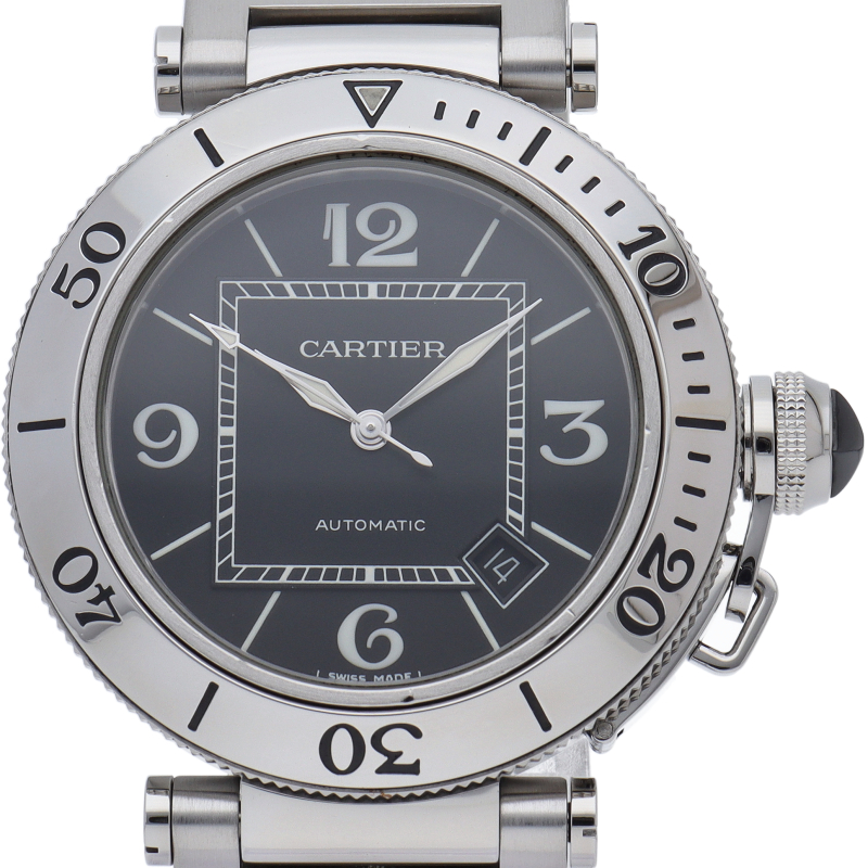 カルティエの人気シリーズ「パシャ」を上品なダイバーズ・ウォッチに仕上げた「シータイマー」。デイト表示,逆回転防止ベゼルと実用性も兼ね備えた1本。