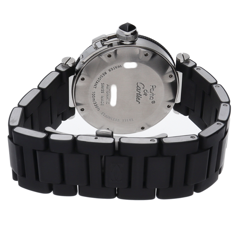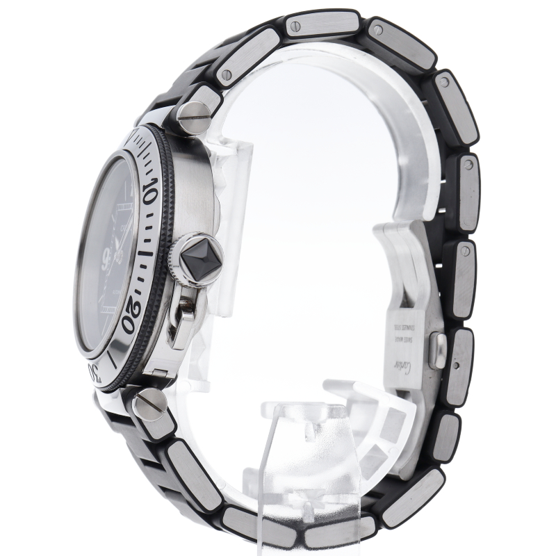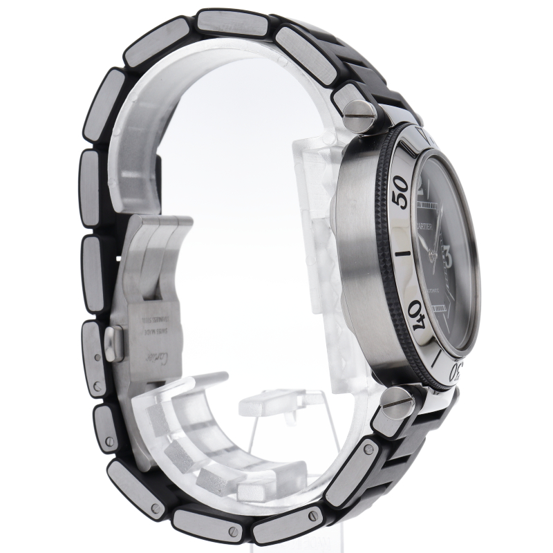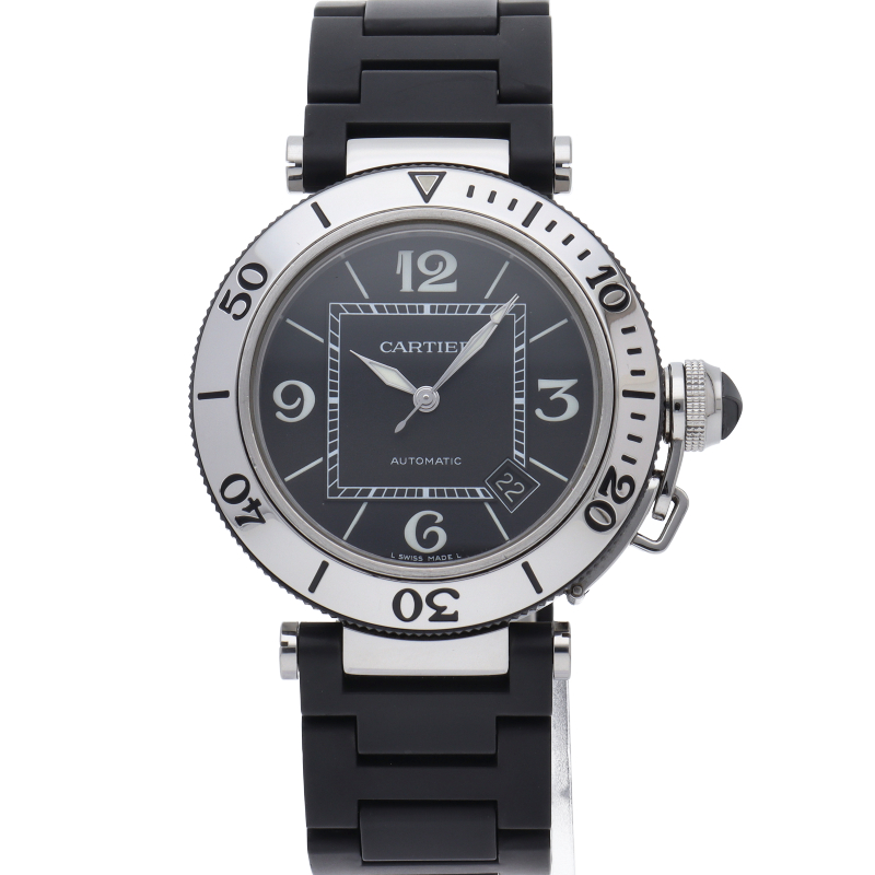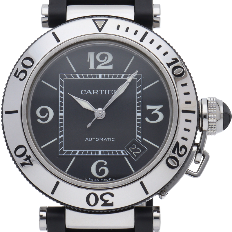 カルティエの人気シリーズ「パシャ」を上品なダイバーズ・ウォッチに仕上げた「シータイマー」。デイト表示,逆回転防止ベゼルと実用性も兼ね備えた1本。