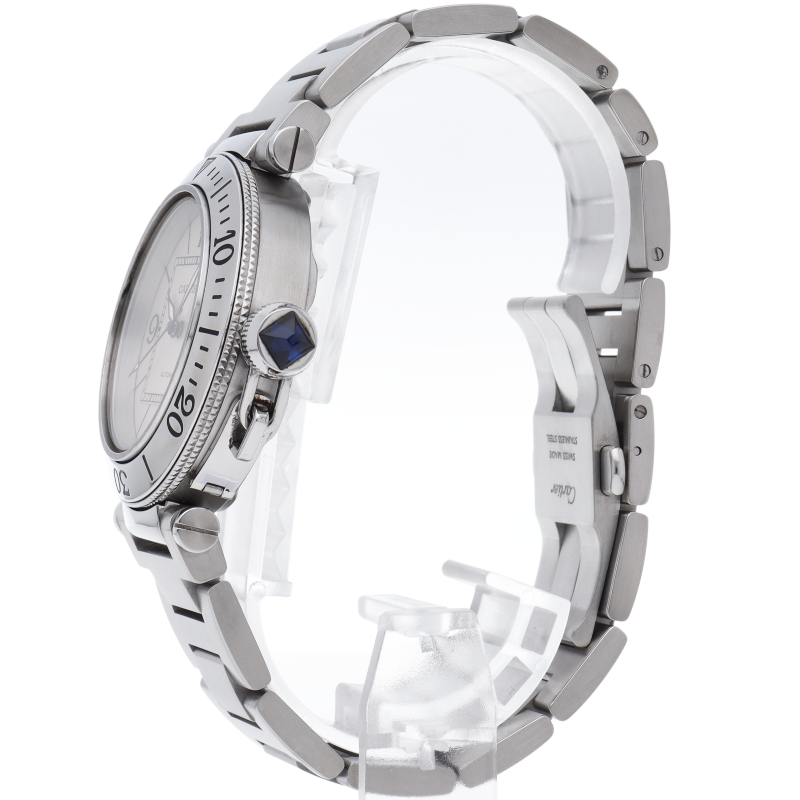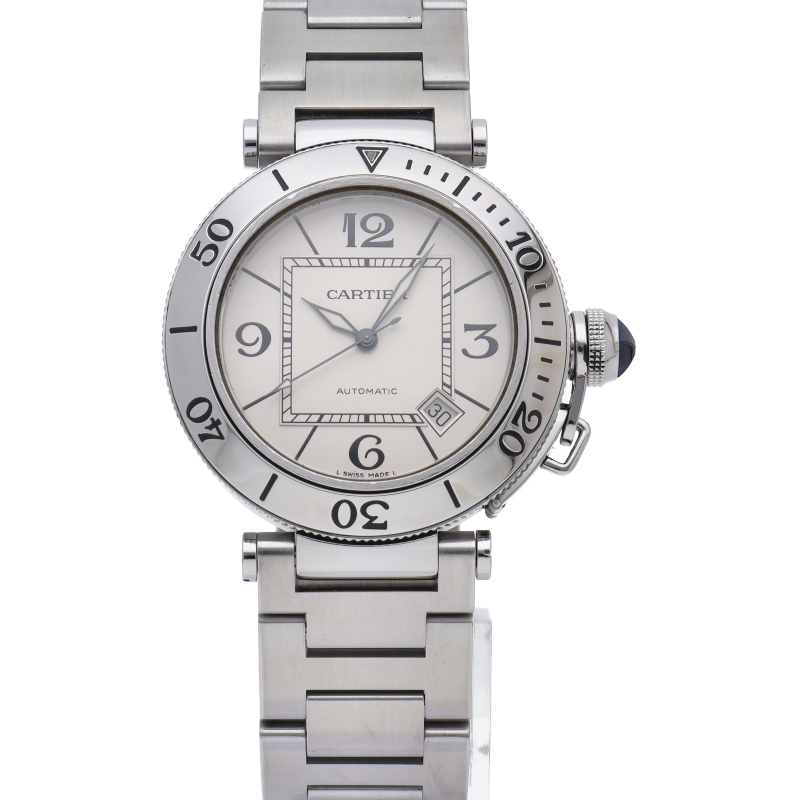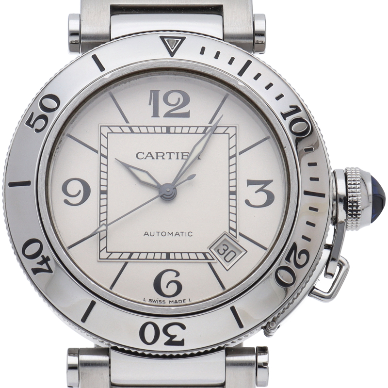 カルティエの人気シリーズ「パシャ」を上品なダイバーズ・ウォッチに仕上げた「シータイマー」。デイト表示,逆回転防止ベゼルと実用性も兼ね備えた1本。