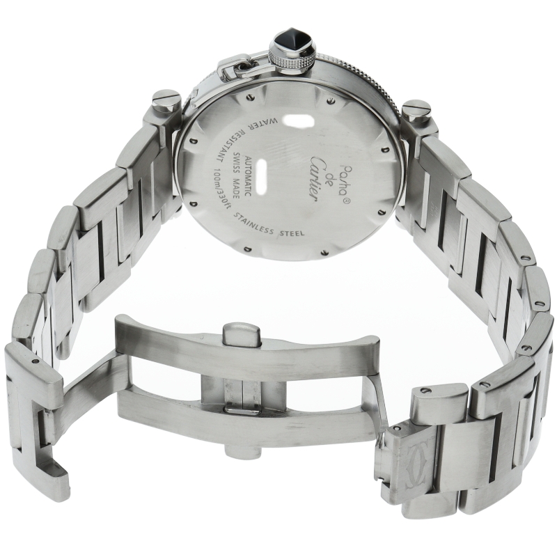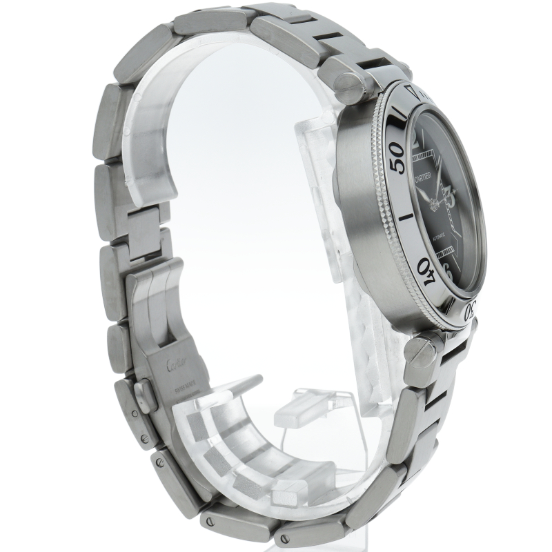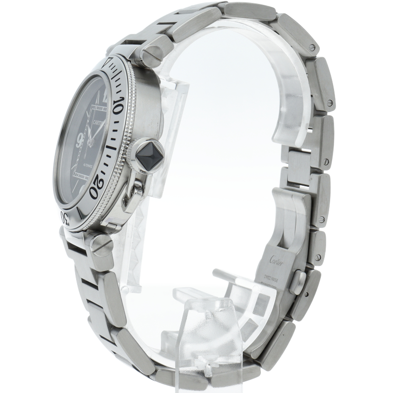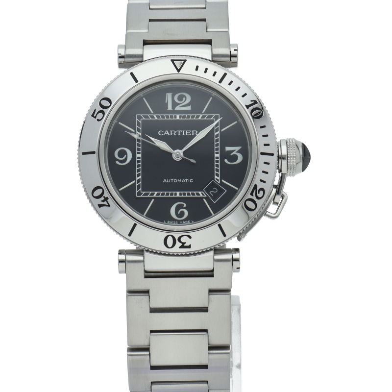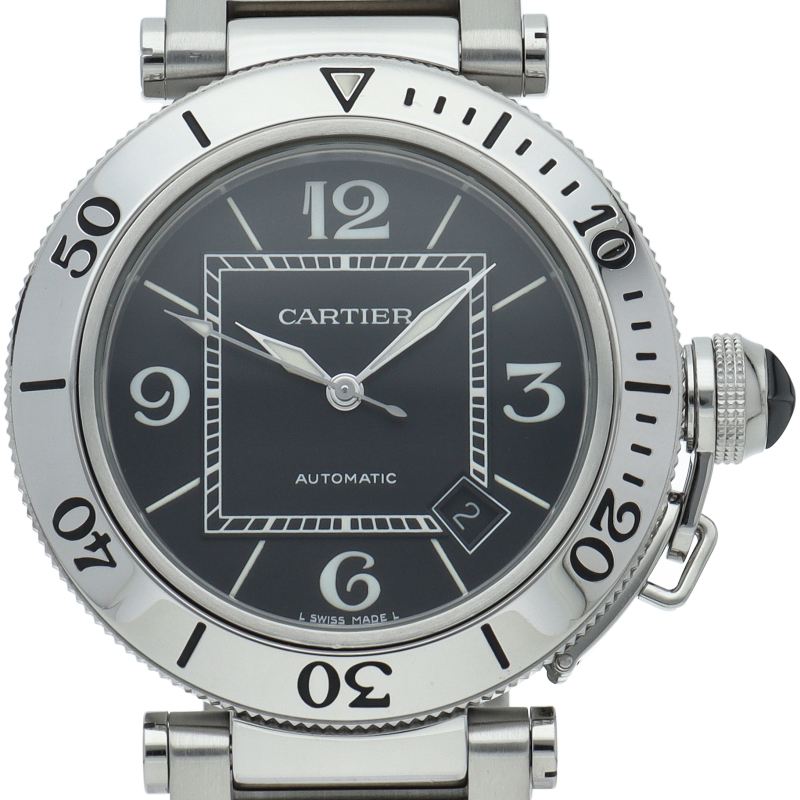 カルティエの人気シリーズ「パシャ」を上品なダイバーズ・ウォッチに仕上げた「シータイマー」。デイト表示,逆回転防止ベゼルと実用性も兼ね備えた1本。