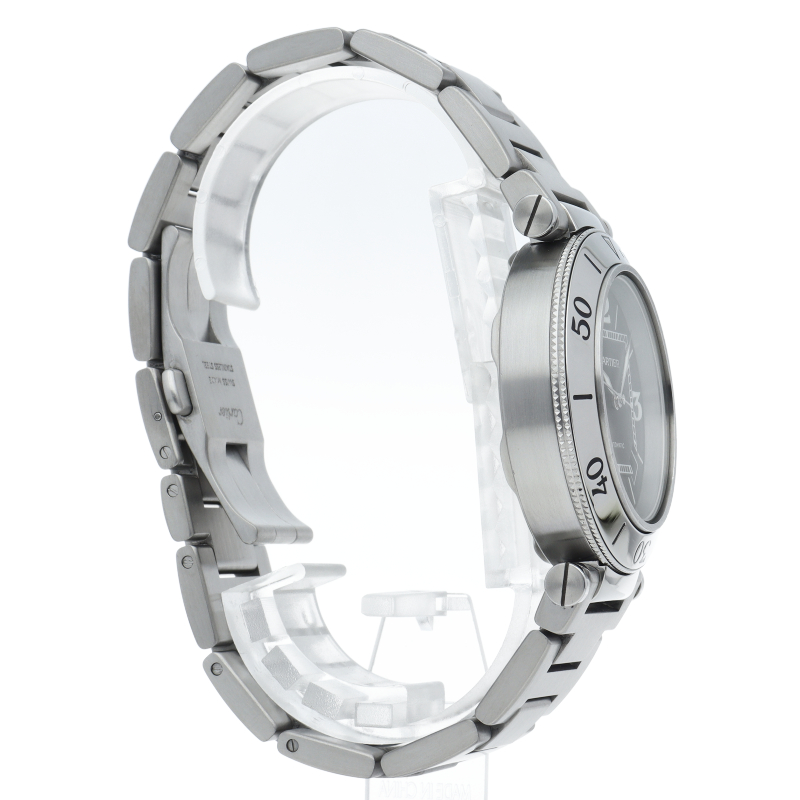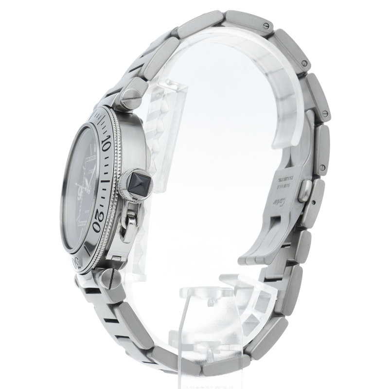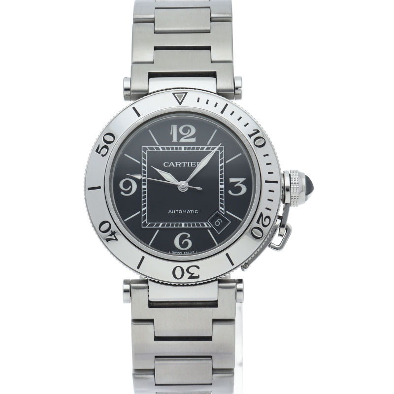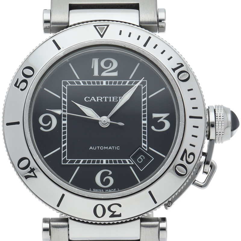 カルティエの人気シリーズ「パシャ」を上品なダイバーズ・ウォッチに仕上げた「シータイマー」。デイト表示,逆回転防止ベゼルと実用性も兼ね備えた1本。