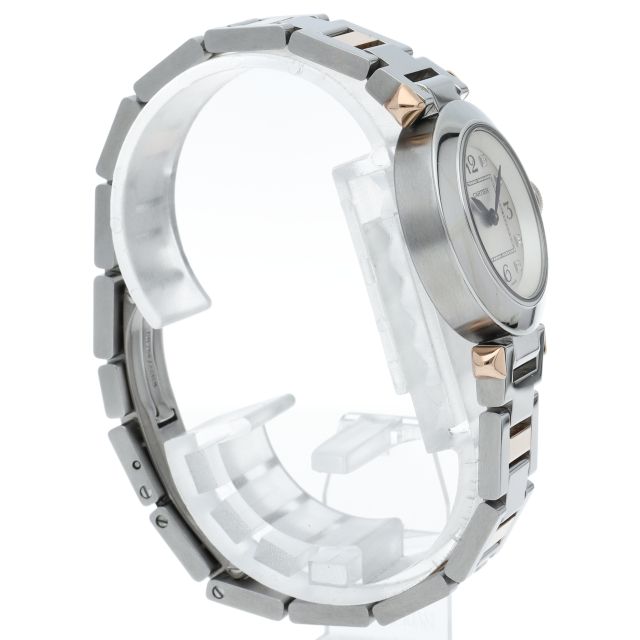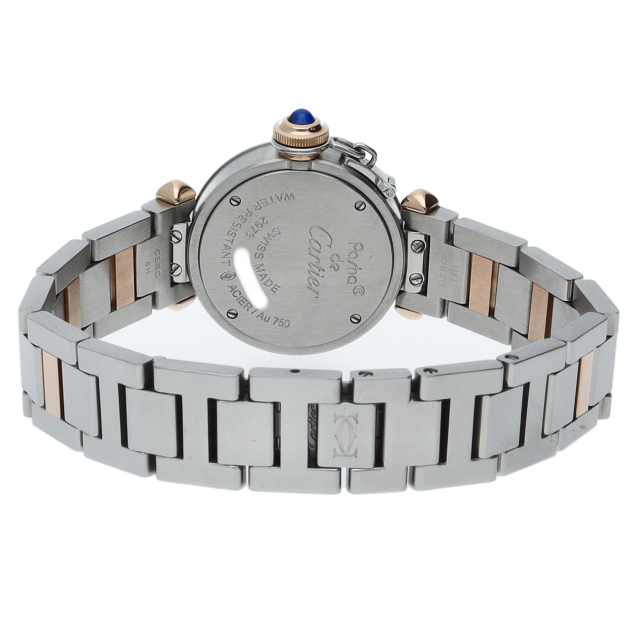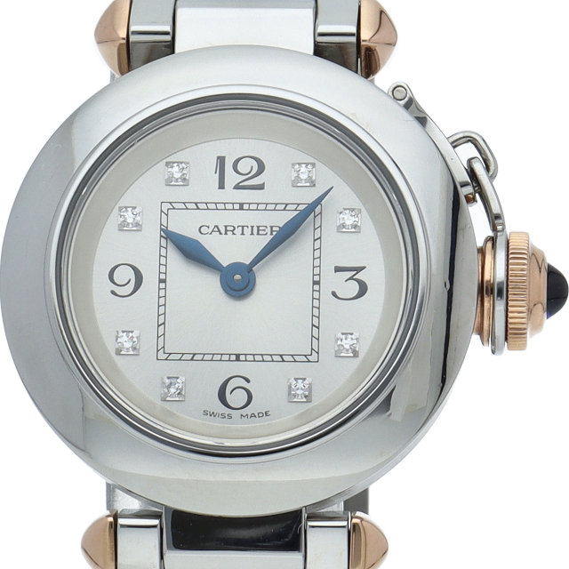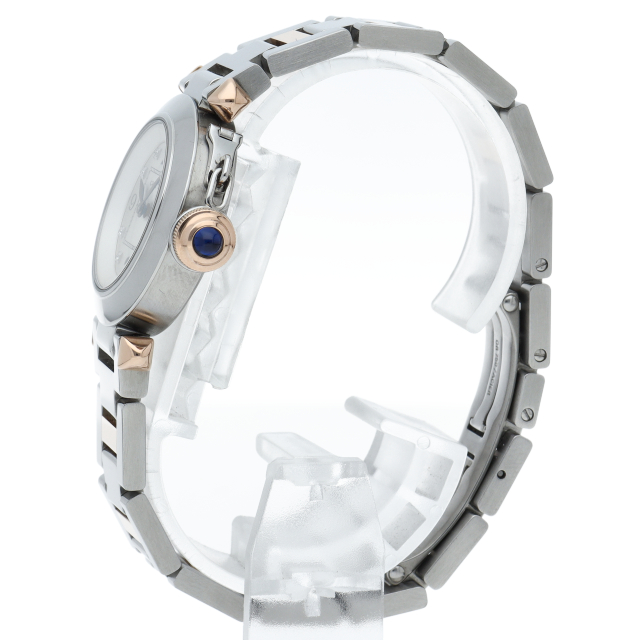 カルティエの人気「パシャ」シリーズの小振りで女性にオススメのモデル、ミスパシャ。こちらは艶ありのシルバーケースにブルースピネルが施されたリューズプロテクターを使用しており、カルティエらしいシンプルでクラシカルなデザインは、スーツやジャケットに相性抜群です。
