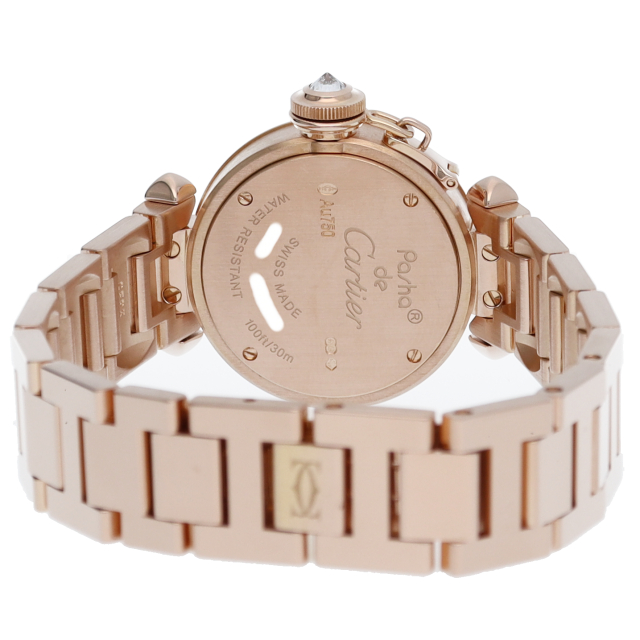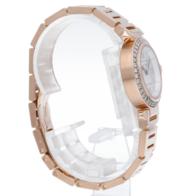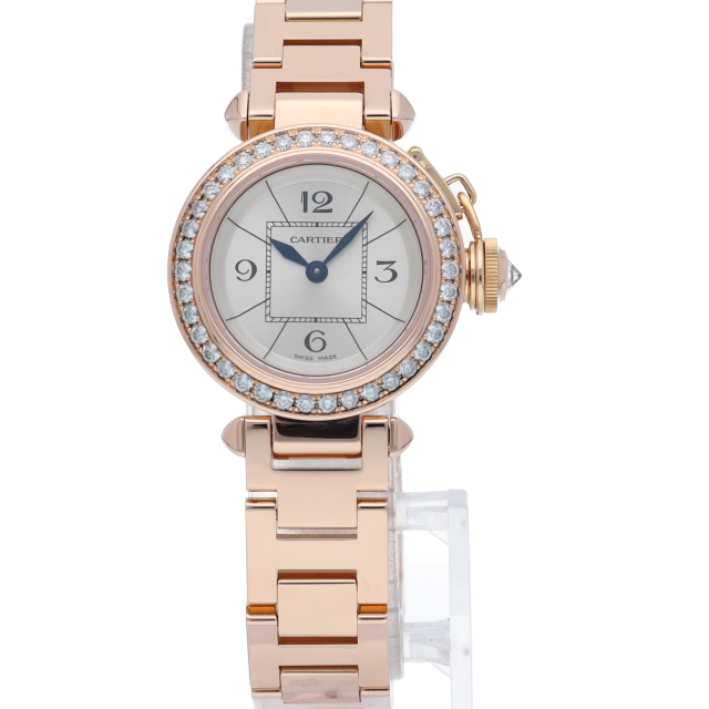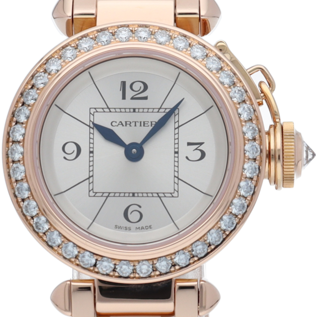 カルティエの人気「パシャ」シリーズの小振りで女性にオススメの新型モデル、ミスパシャ。可愛らしいデザインでシンプルにまとまったスタイルを選ばない1本。ベゼルにはダイヤモンドが施されております。