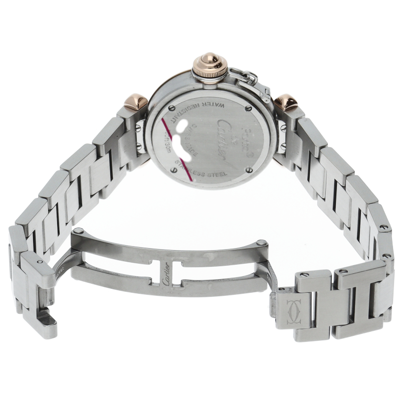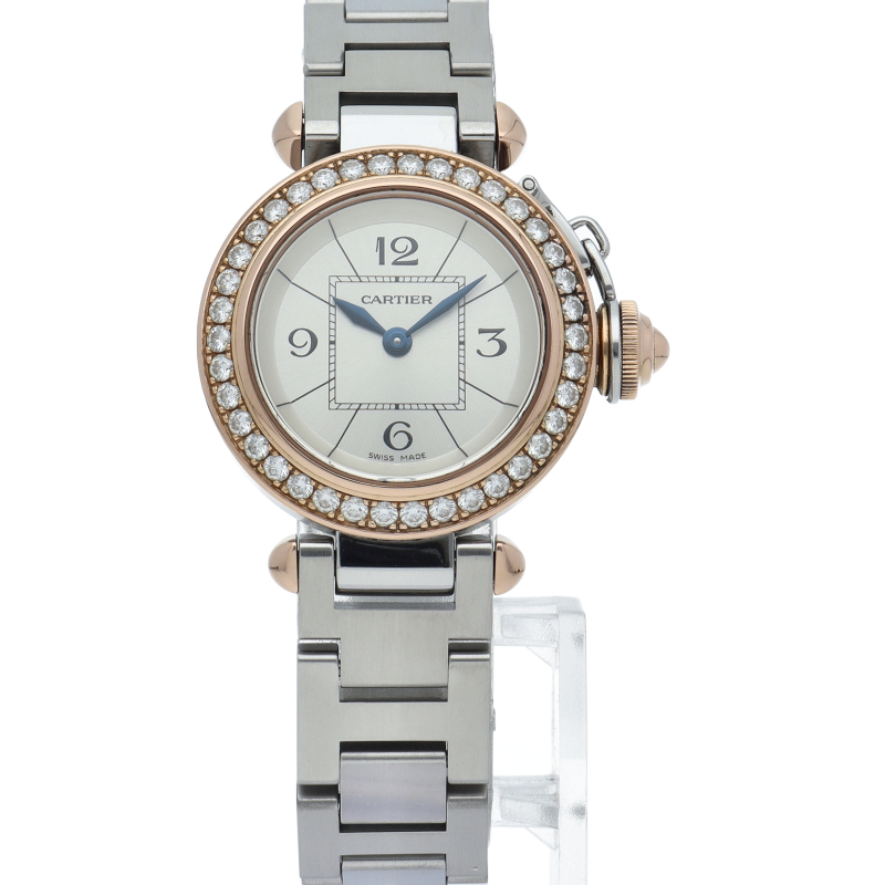 カルティエの人気「パシャ」シリーズの小振りで女性にオススメの新型モデル、ミスパシャ。可愛らしいデザインでシンプルにまとまったスタイルを選ばない1本。ベゼルのいはダイヤモンドが施されております。
