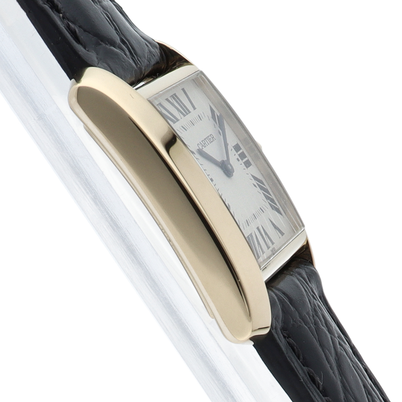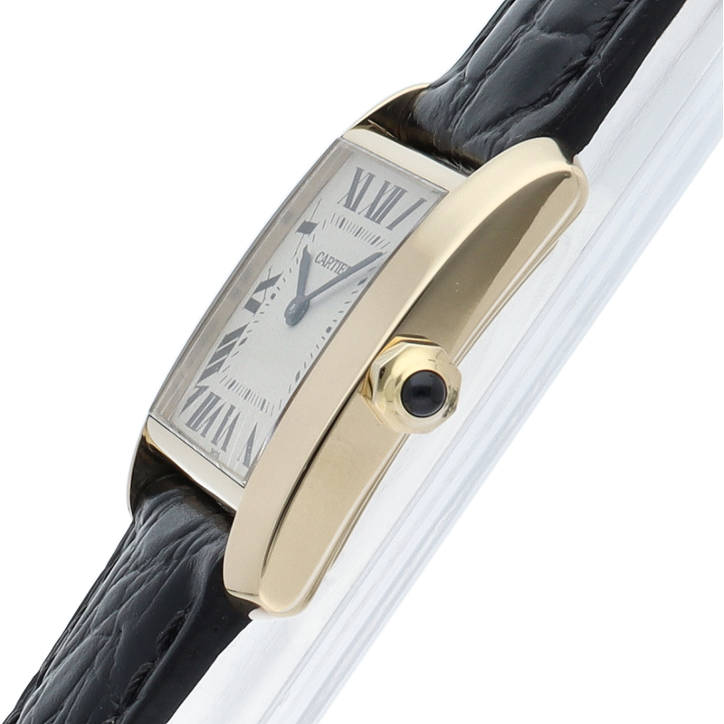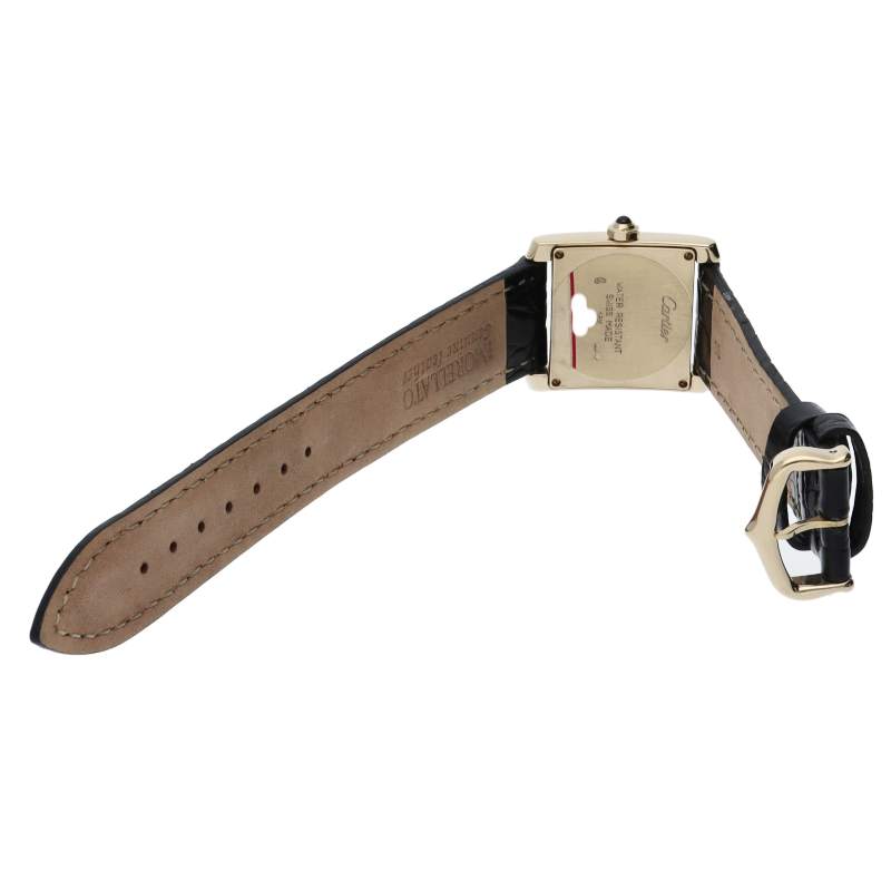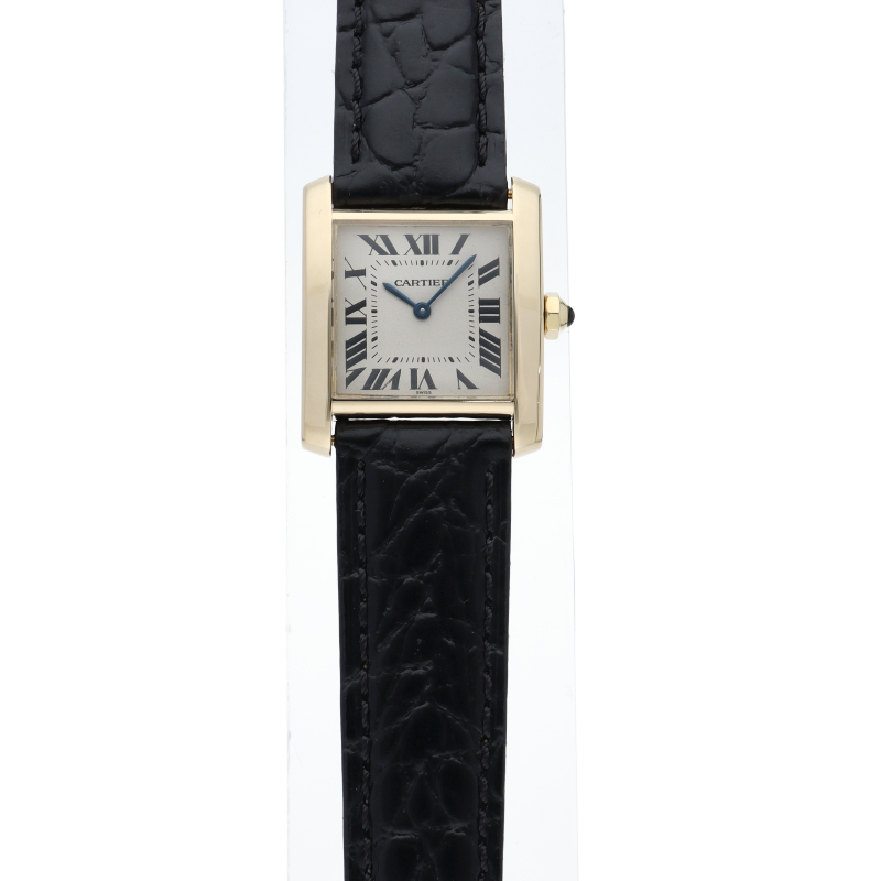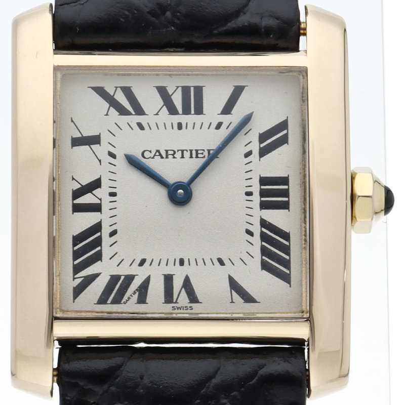カルティエを代表する人気モデル“タンクフランセーズ”のユニセックスモデルです。イエローゴールドに革ベルトを合わせた、シンプルかつ上品なモデルです。