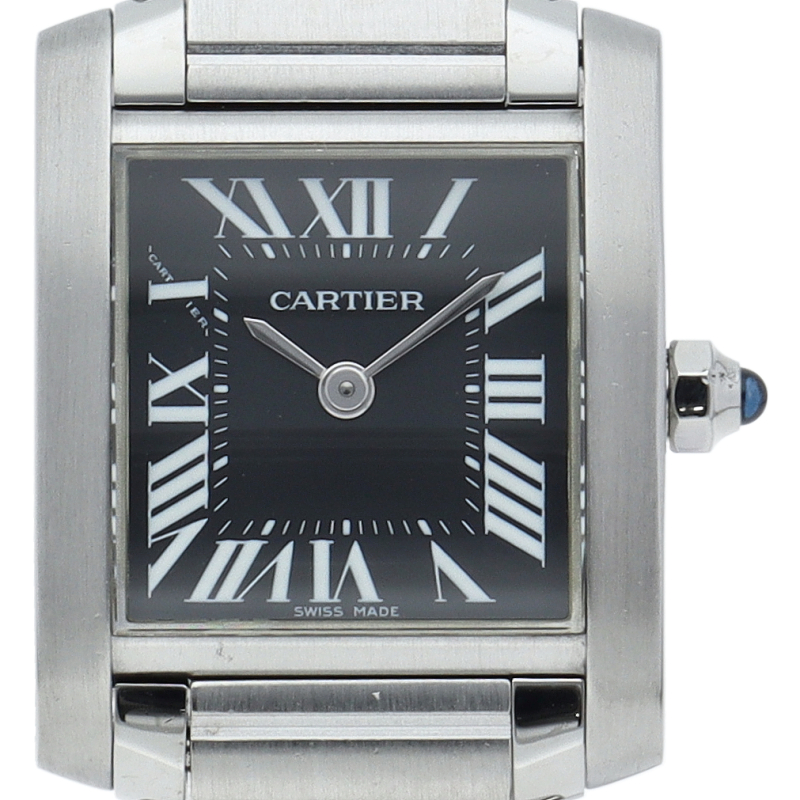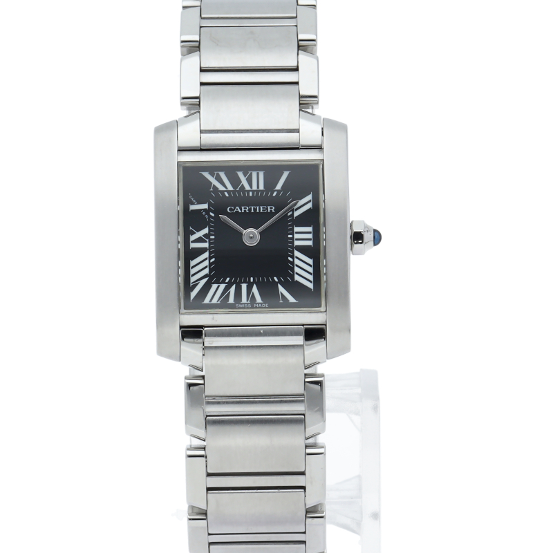 カルティエの言わずと知れた人気シリーズ「タンクフランセーズ」。シンプルでオーソドックなデザインとスタイルを選ばず着けられる気軽さが人気です。アジア限定モデルの希少な黒文字盤です。