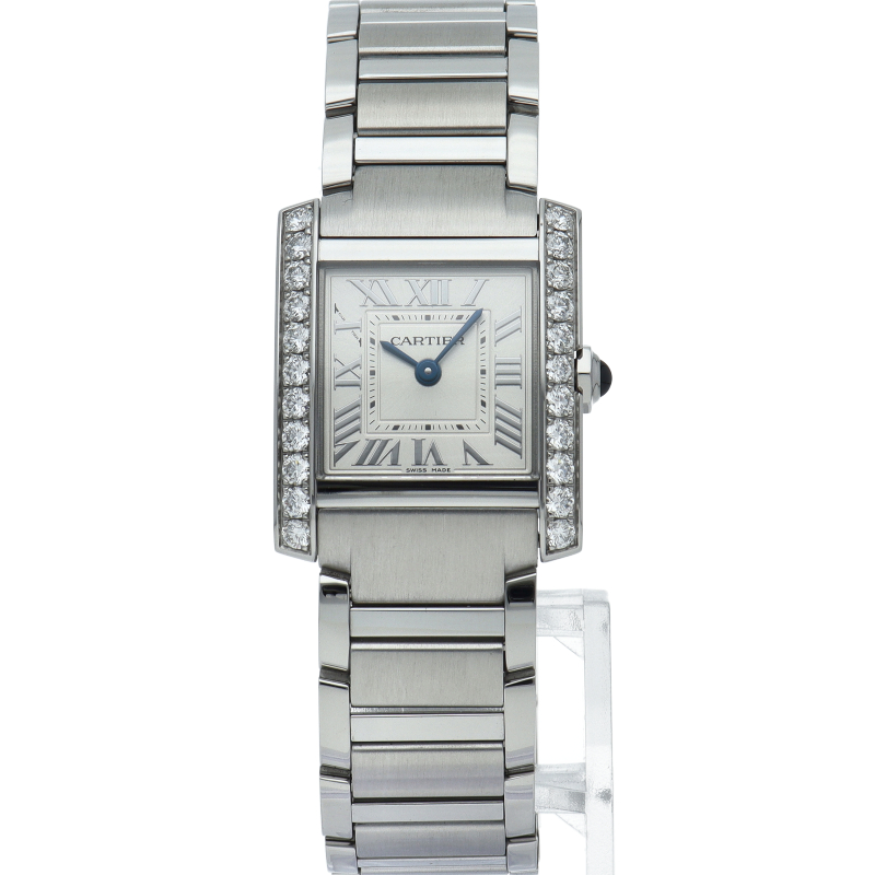 カルティエの人気モデル「タンクフランセーズ」。ケースサイドにダイヤモンドがセッティングされたワンランク上のモデルです。