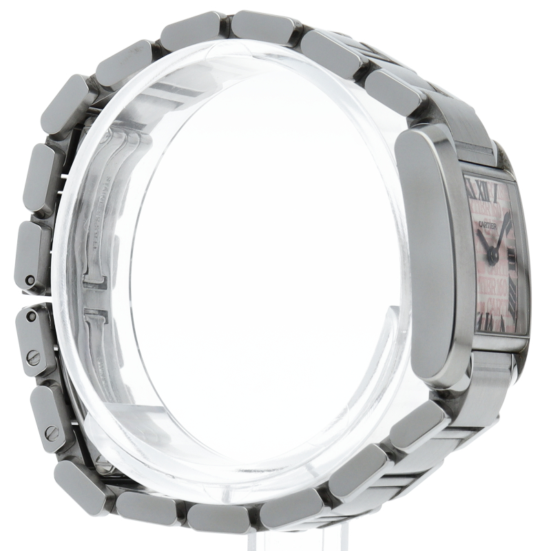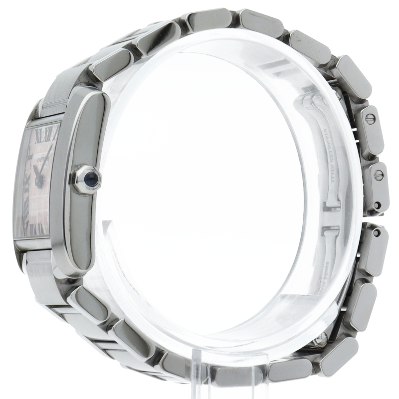 カルティエの言わずと知れた人気シリーズ「タンクフランセーズ」。上品なシルバーカラーにピンクのロゴがよく映え、落ち着きのあるデザインの中に、女性らしさを加えているセンスは、さすがと思わせます。ケースバックに 1847-2007 の刻印がされていて、記念モデルであるという思いを更に強くしてくれます。