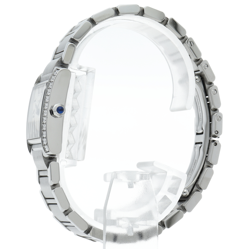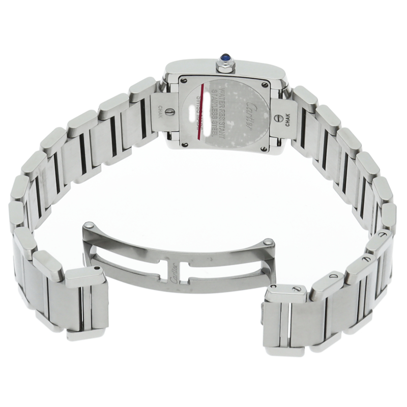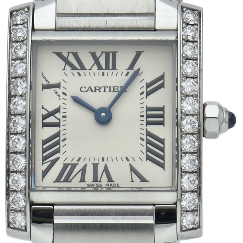 カルティエの人気モデル「タンクフランセーズ」。ケースサイドにダイヤモンドがセッティングされたワンランク上のモデルです。