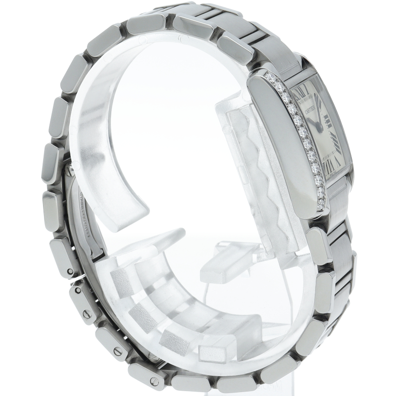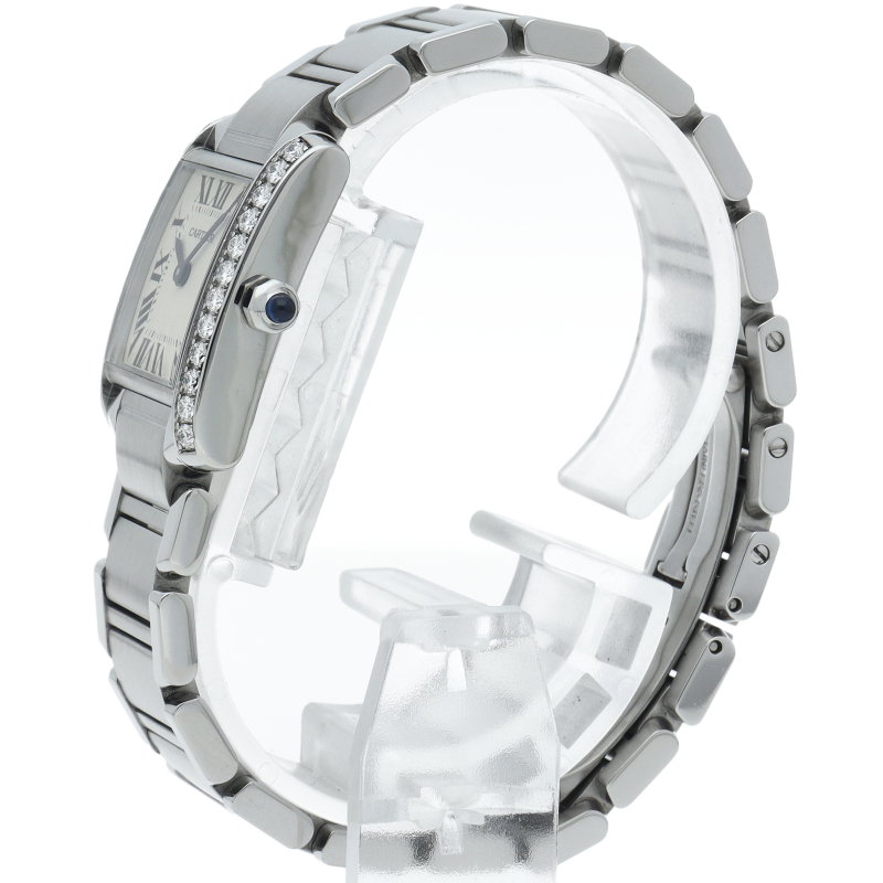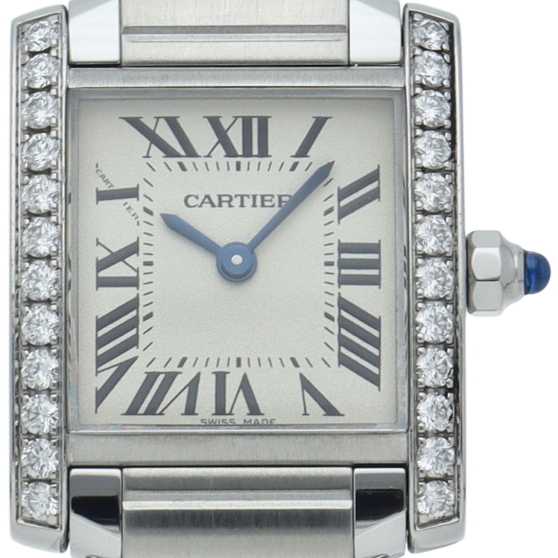 カルティエの人気モデル「タンクフランセーズ」。ケースサイドにダイヤモンドがセッティングされたワンランク上のモデルです。
