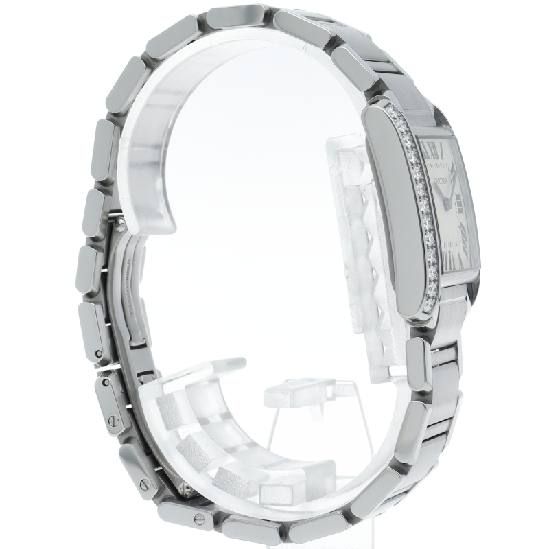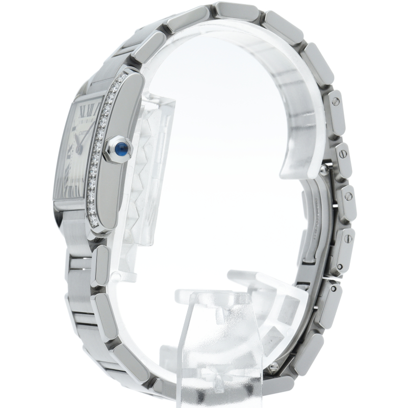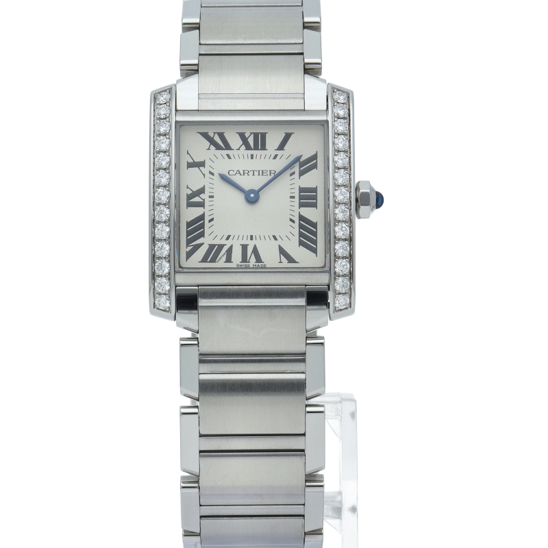 カルティエの人気モデル「タンクフランセーズ」。ケースサイドにダイヤモンドがセッティングされたワンランク上のモデルです。