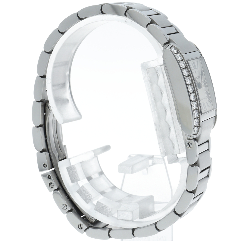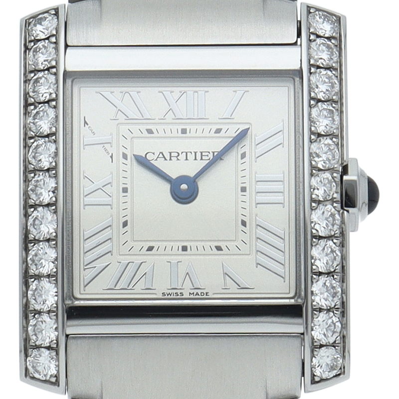 カルティエの人気モデル「タンクフランセーズ」。ケースサイドにダイヤモンドがセッティングされたワンランク上のモデルです。