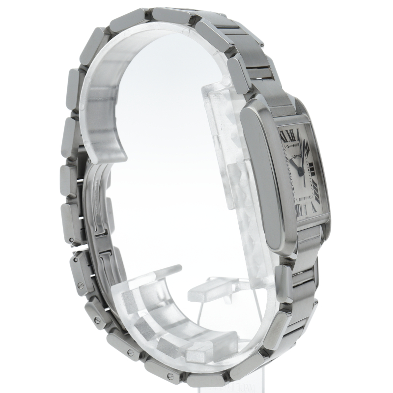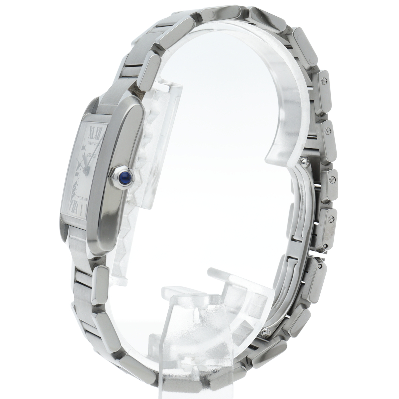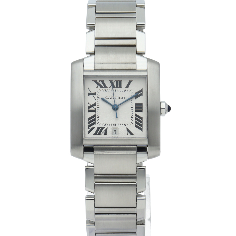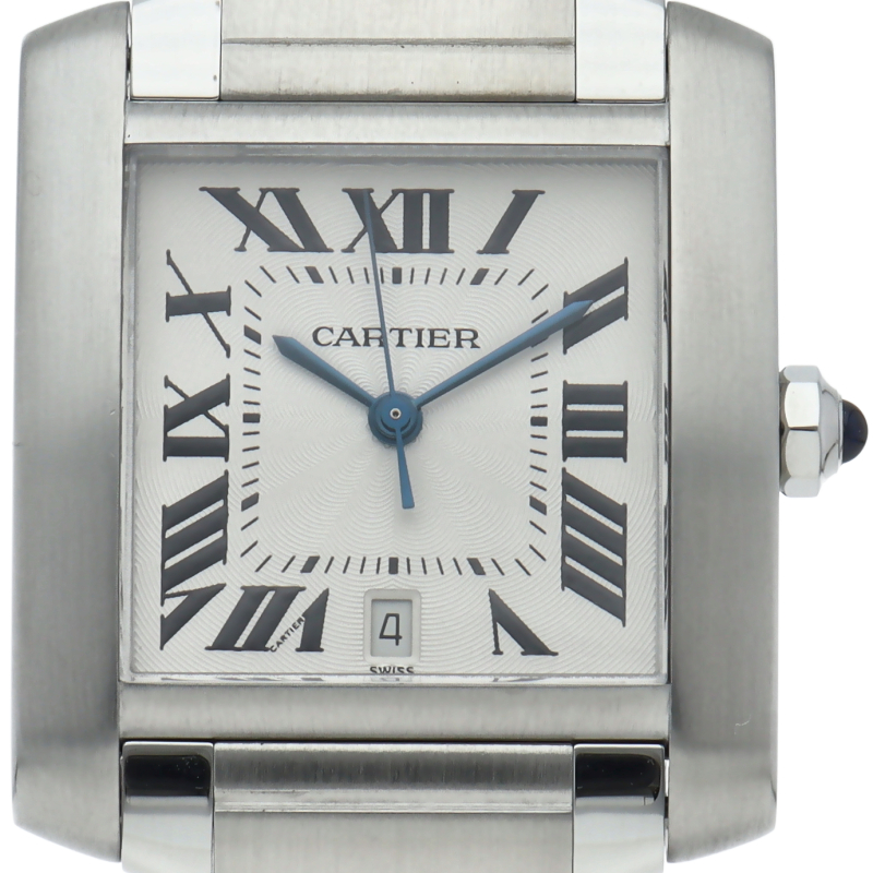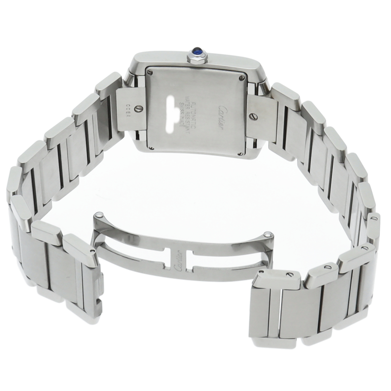 カルティエ「タンクフランセーズLM」(W51002Q3)。洗練されたステンレスの輝きが魅力の自動巻きモデルです。6時位置にデイト表示を備え、ギョーシェ彫りの文字盤が高級感を演出。戦車のキャタピラを模したブレスレットはフィット感も抜群。ビジネスシーンでも頼れる、知的な大人のためのタイムピースです。