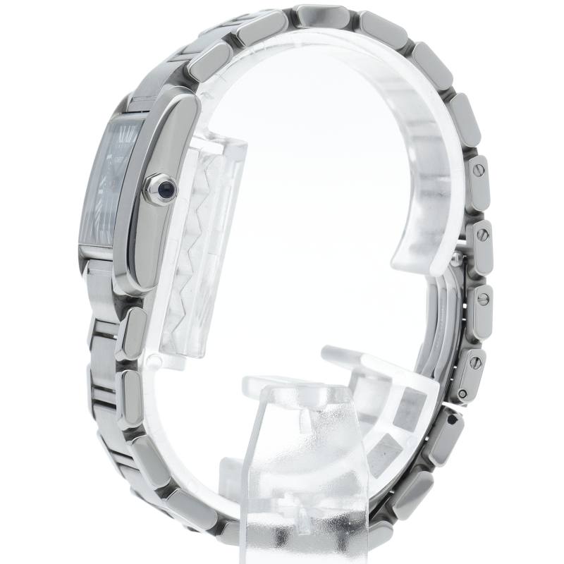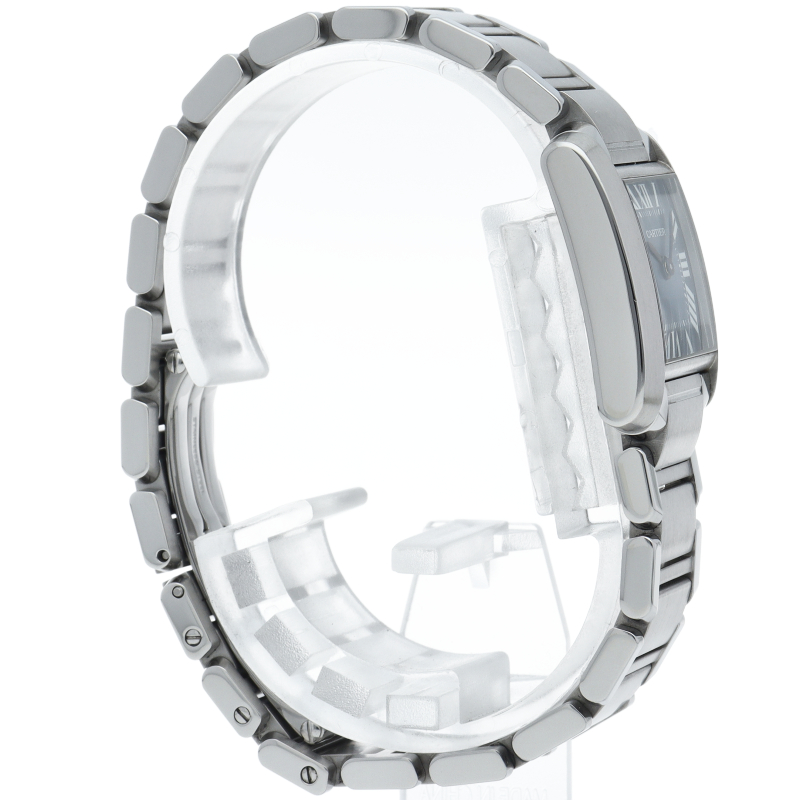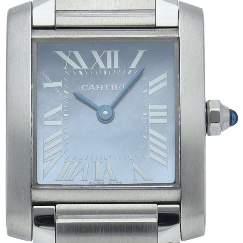 カルティエの言わずと知れた人気シリーズ「タンクフランセーズ」。2008年に発売された、ブルーシェルダイヤルの商品です。シェルダイヤル特有のきらめきが高級感を感じさせます。