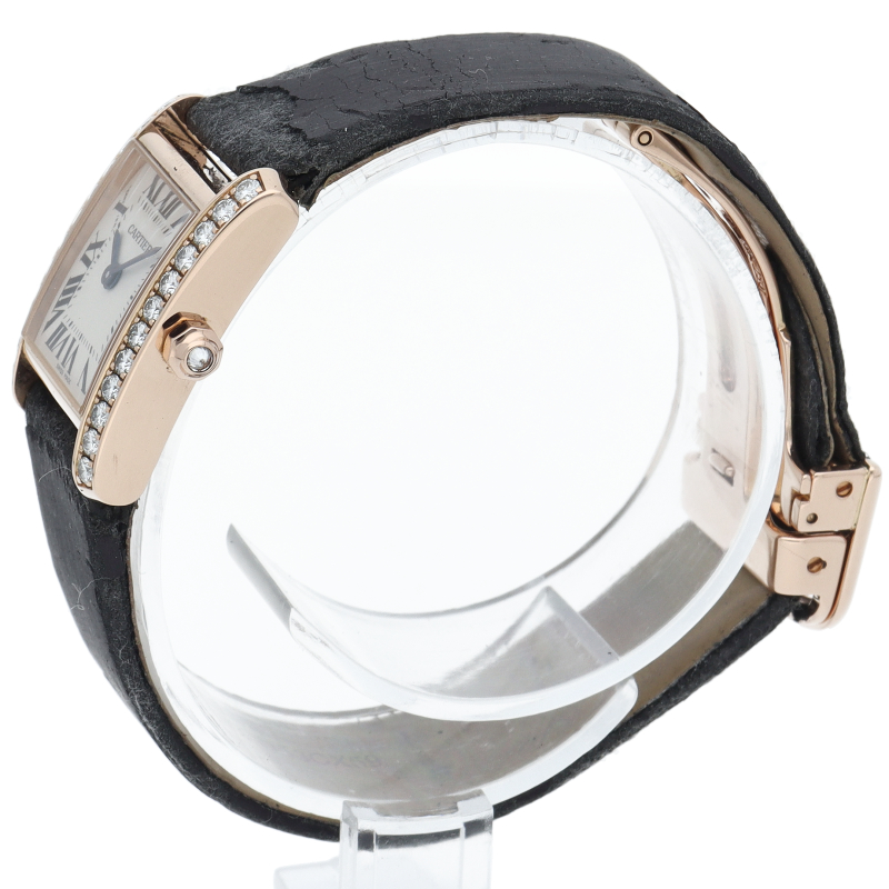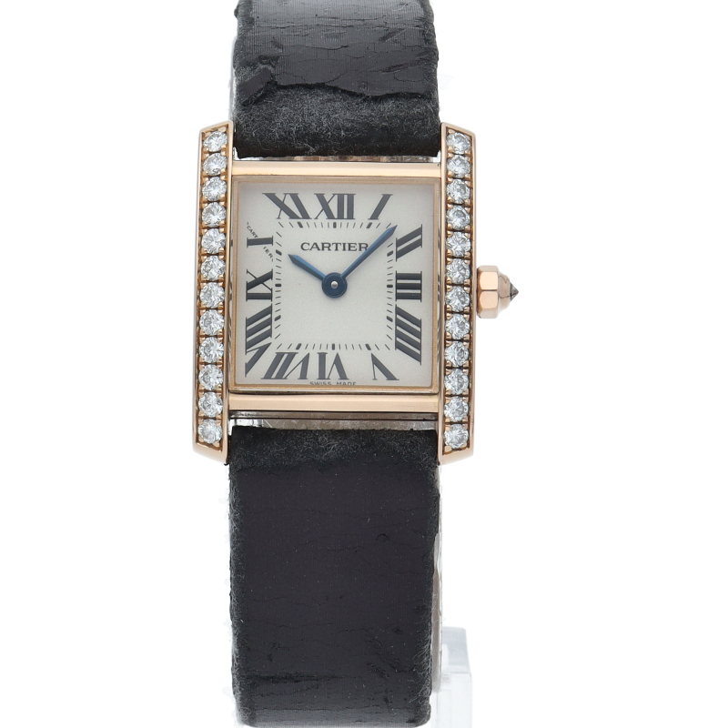 カルティエの言わずと知れた人気シリーズ「タンクフランセーズ」。ピンクゴールドを使用してベゼルにはダイヤモンドが施されたブレスレット感覚で着用できるステータスウォッチです。