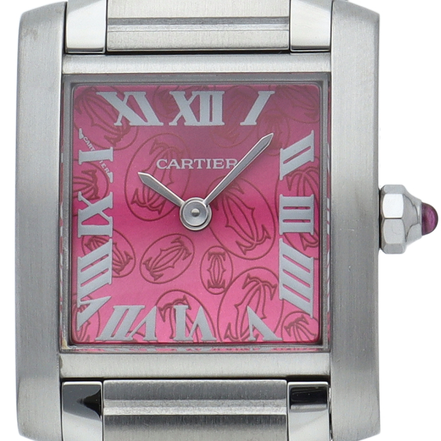 カルティエの言わずと知れた人気シリーズ「タンクフランセーズ」。2006年のクリスマス限定モデル。鮮やかなラズベリー色の文字盤の中にカルティエのロゴがデザインされたとってもキュートな一本です。