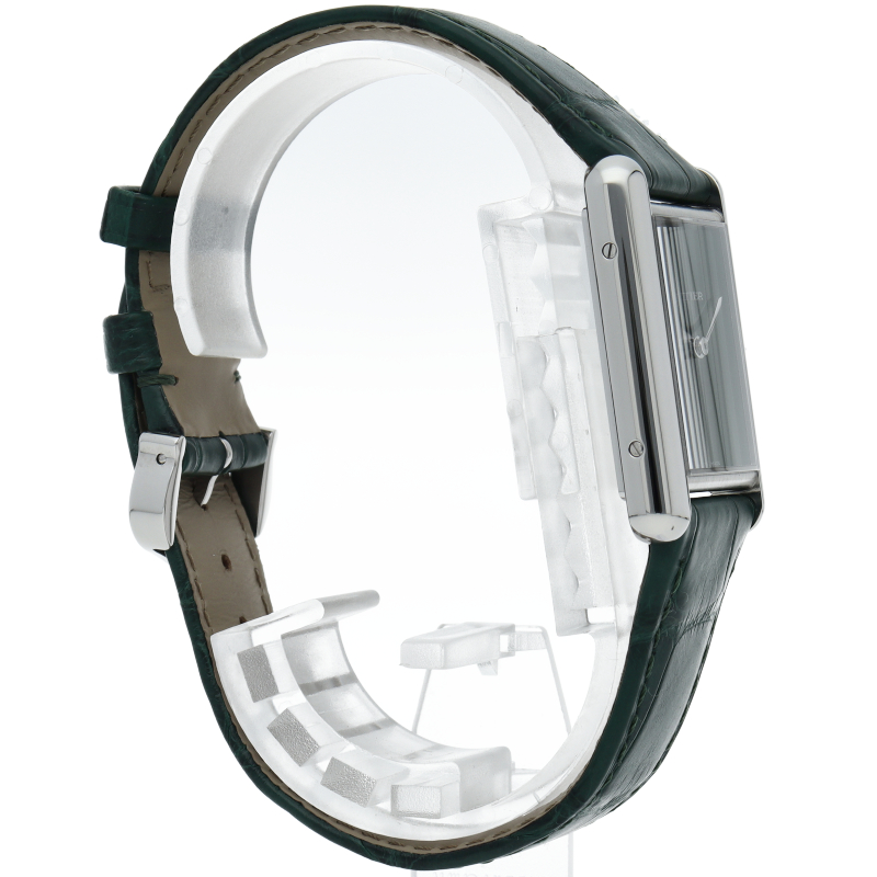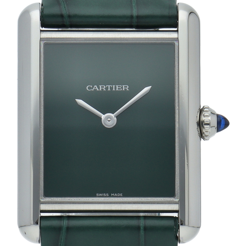 タンク ルイ カルティエの様な丸みのあるフォルムが特徴です。リューズのカボションはシンセティックスピネルになります。 グリーンラッカーダイヤルにグリーンのアリゲーターストラップが洗練された印象です。2021年発表モデル。