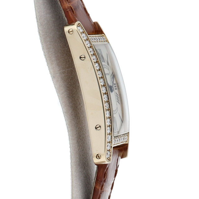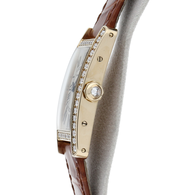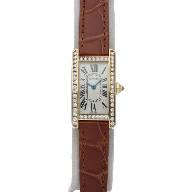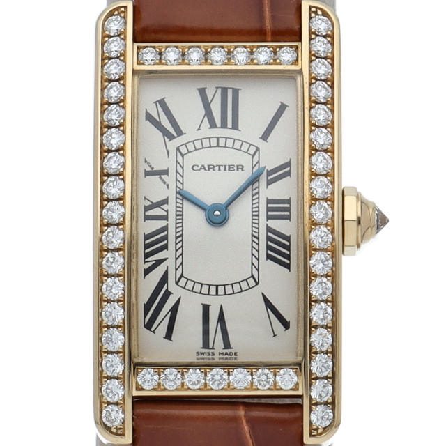 縦長ケースが特徴の人気シリーズ「タンクアメリカン」。古くからあるモデルですが、こちらの一粒ダイヤでベゼルを取り巻いたタイプは、以前の2重巻きのタイプと比べると、ダイヤが大粒な分、贅沢な印象になりました。