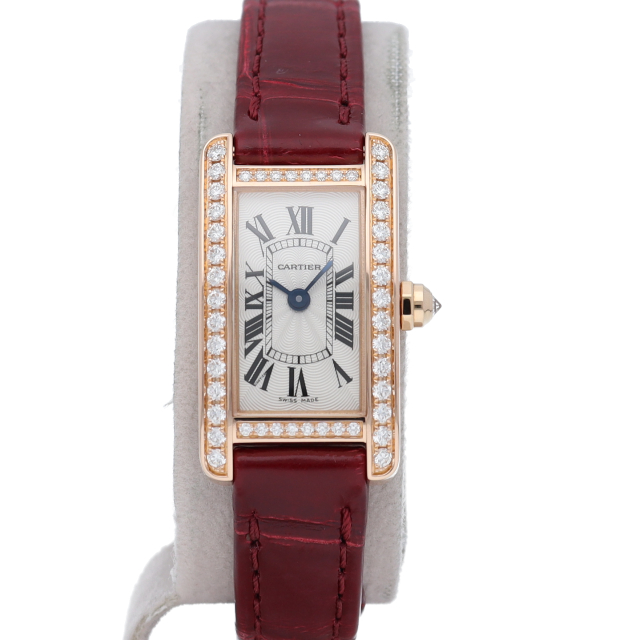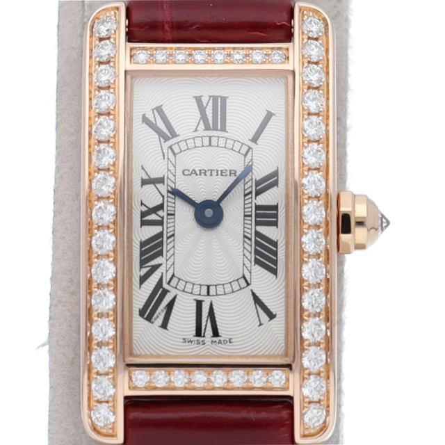 日常生活でも使いやすいモデルとして人気の高いタンクシリーズ。縦長のケースが特徴的な「タンク アメリカン」のミニサイズで、女性の腕にさりげなくフィットします。
