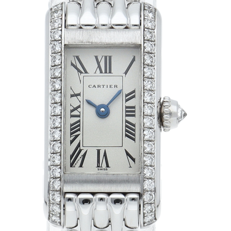 縦長ケースが特徴のタンクアメリカン。八角形のリューズにはサファイヤが埋め込まれています。シャープな印象もありつつ、エレガントさも兼ね備えている逸品です。