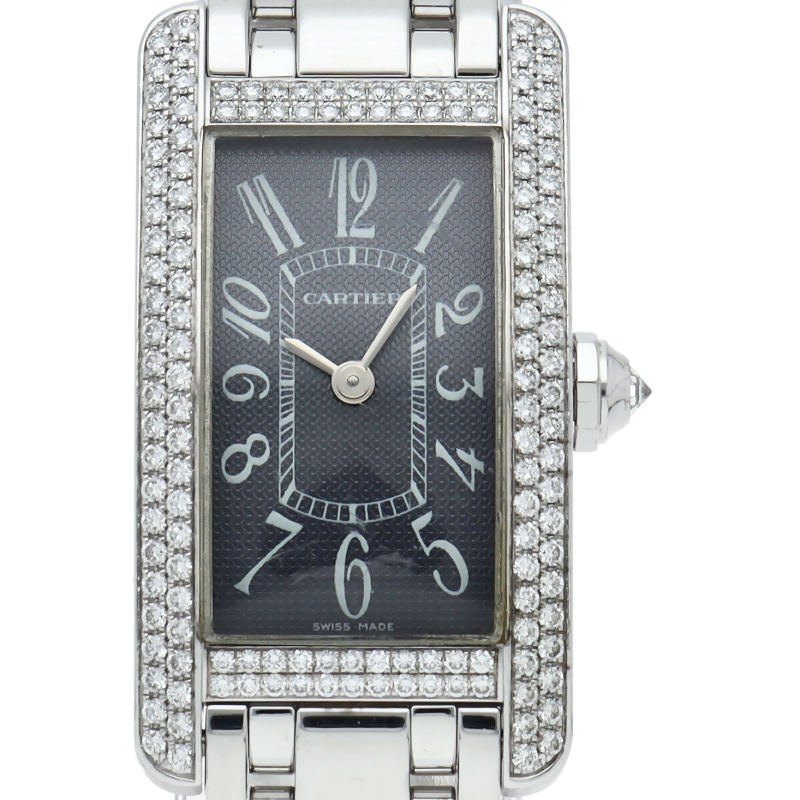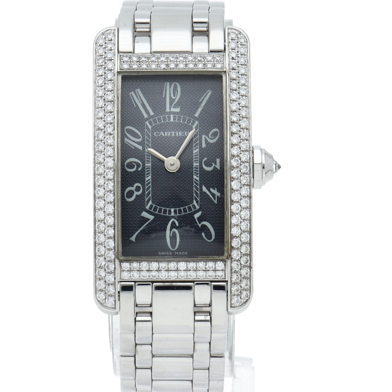 二本の平行するバーを特徴とするタンクシリーズの中でも、縦方向に長いデザインが個性的な「タンクアメリカン」。八角形のリューズにはファセットを施したサファイアがセッティングされています。シャープさと丸みを組み合せたレクタンギュラーケースは、クラシカルな雰囲気を持ちつつ、知性も感じさせてくれるデザインです。