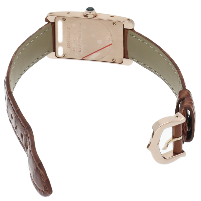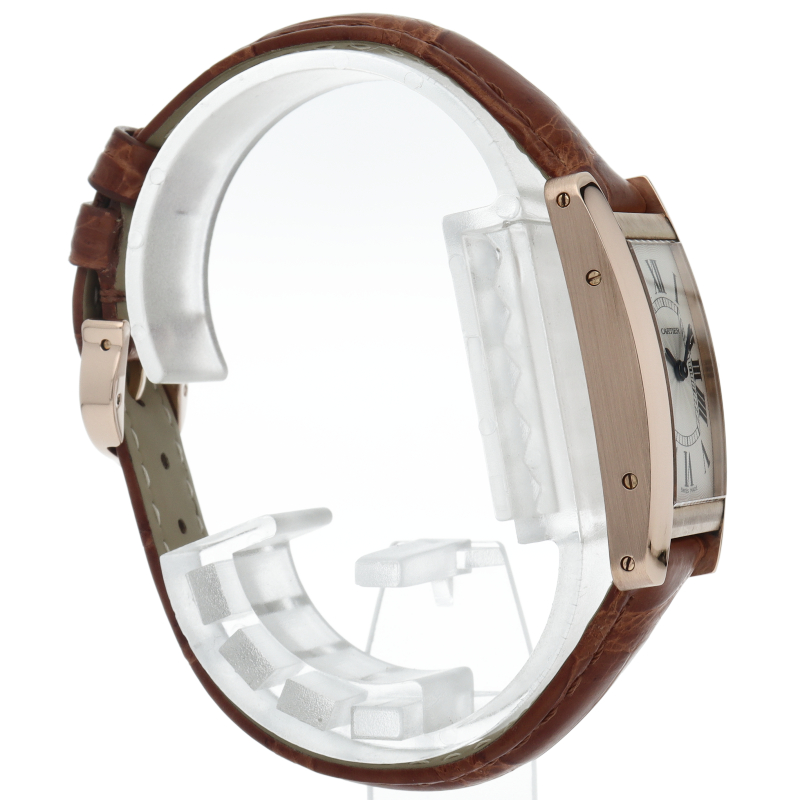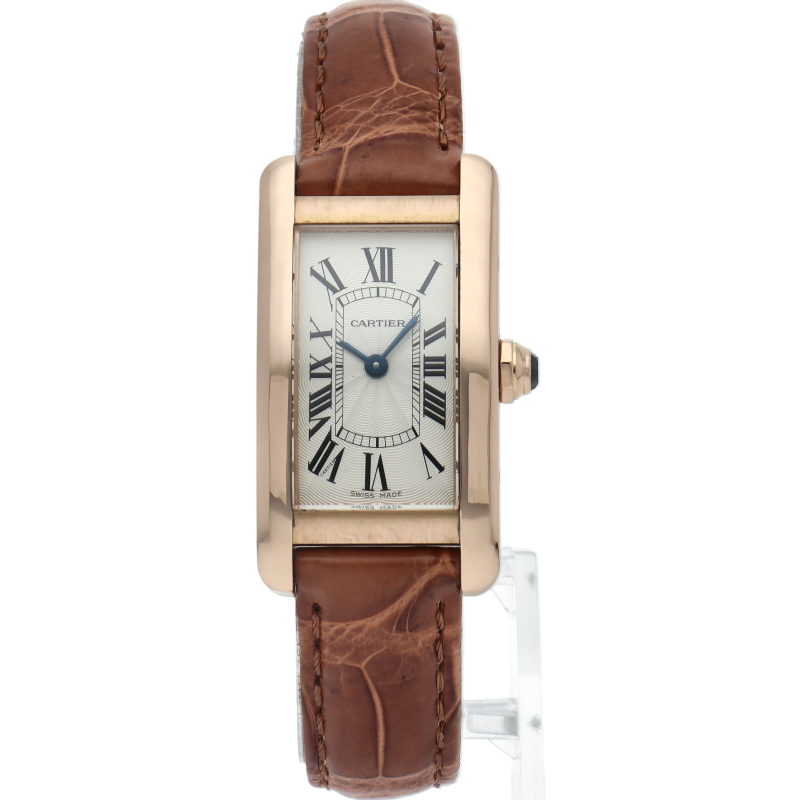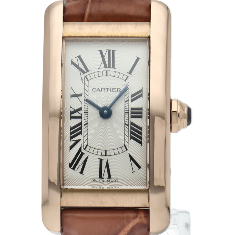 二本の平行するバーを特徴とするタンクシリーズの中でも、縦方向に長いデザインが個性的な「タンクアメリカン」。八角形のリューズにはファセットを施したサファイアがセッティングされています。シャープさと丸みを組み合せたレクタンギュラーケースは、クラシカルな雰囲気を持ちつつ、知性も感じさせてくれるデザインです。