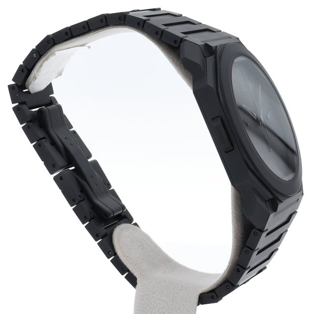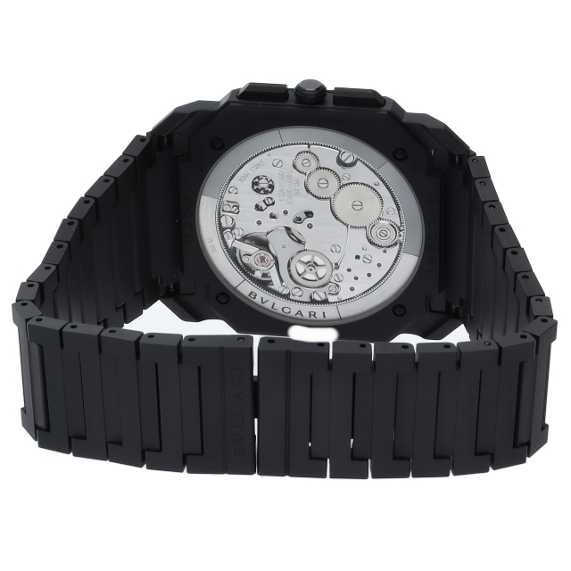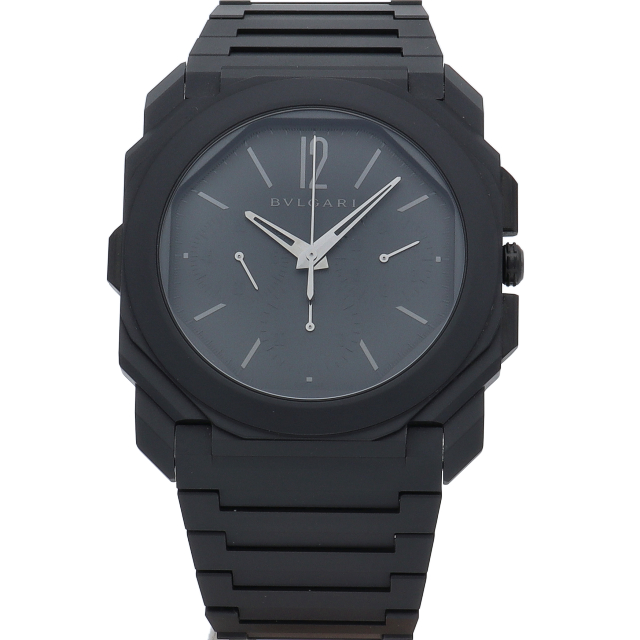 円と八角形が絶妙に組み合わされたデザインで多面カットされたケースやブレスレットが特徴の“オクト”コレクションです。こちらはその中でもケースの厚みをかなり抑えたモデルで7.8mmとなります。ケース素材には非常に耐傷性のあるセラミック製でオールブラックのカラーリングは非常に精悍な雰囲気があります。103278(BGO43XTCHGMT)