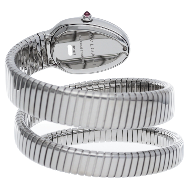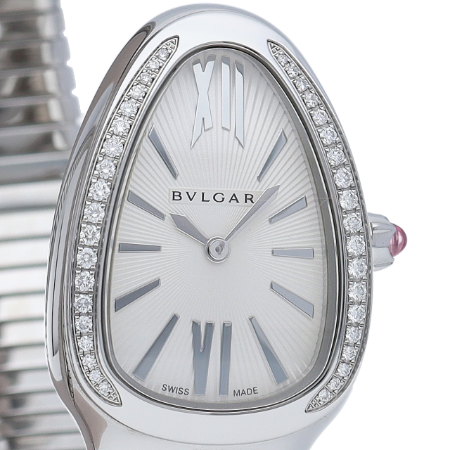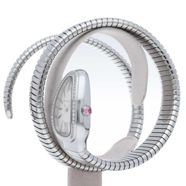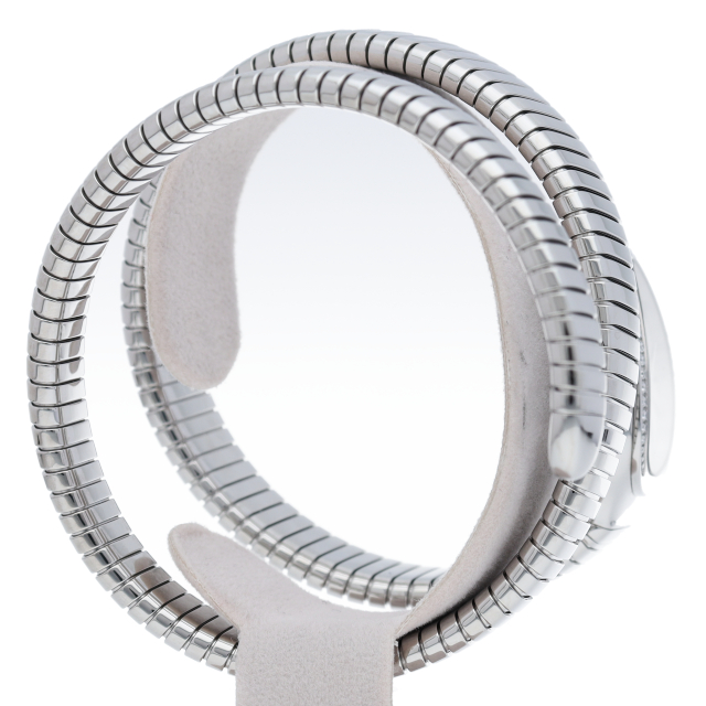 ブルガリのデザインが誇るもっとも象徴的なシンボルの2つを融合させたセルペンティ トゥボガス ウォッチ。イタリア語で蛇を意味するセルペンティという名の通り、蛇のように手首に巻きつくように装着します。 アクセサリー的な要素の強いブルガリの時計はそのデザイン性が高く評価されています。101910(SP35S)