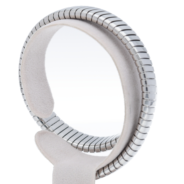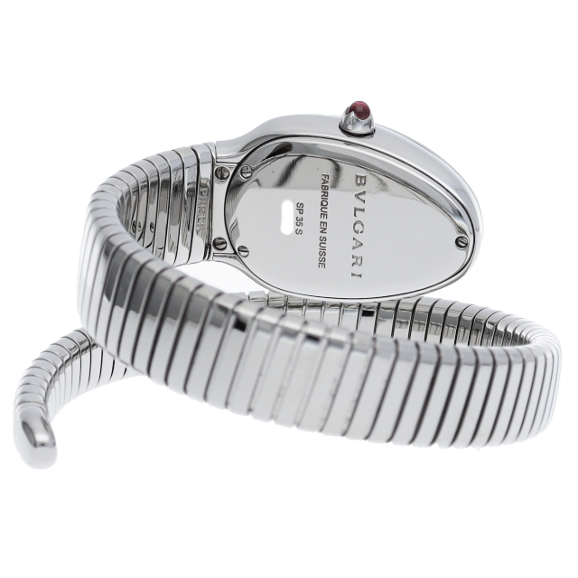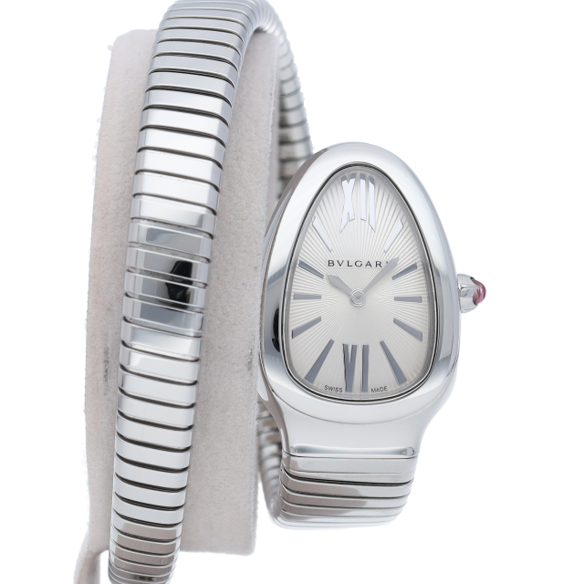 ブルガリのデザインが誇るもっとも象徴的なシンボルの2つを融合させたセルペンティ トゥボガス ウォッチ。イタリア語で蛇を意味するセルペンティという名の通り、蛇のように手首に巻きつくように装着します。 アクセサリー的な要素の強いブルガリの時計はそのデザイン性が高く評価されています。SP35S(101817)