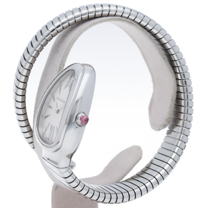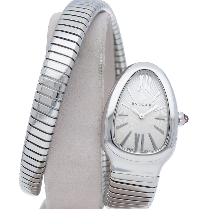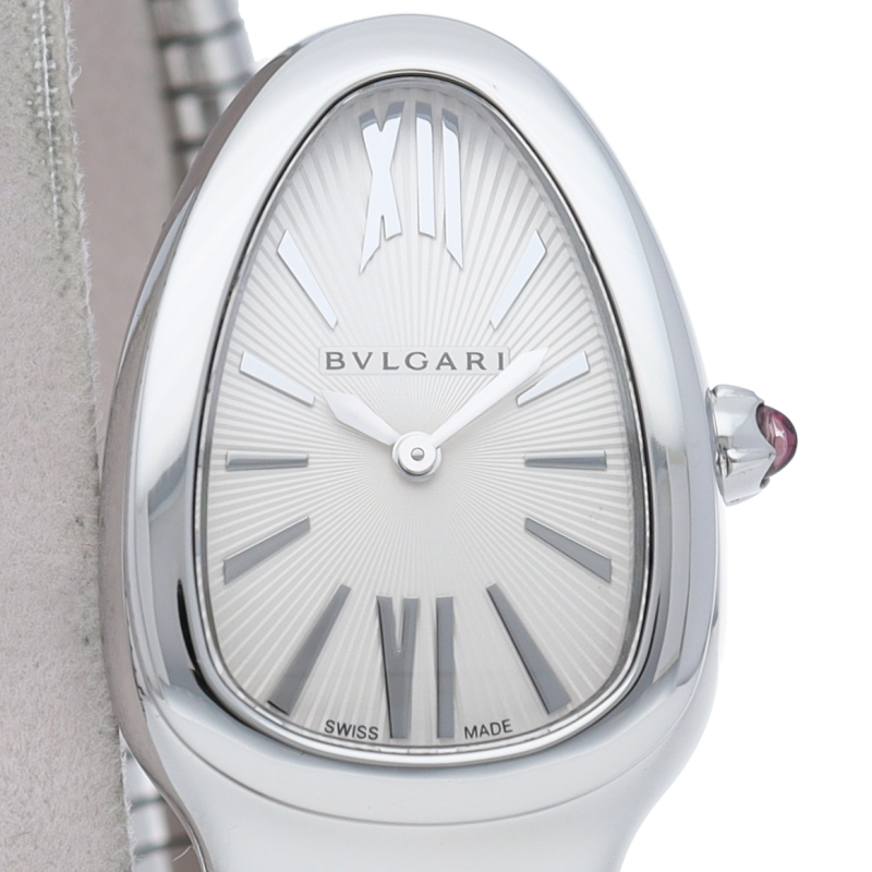 ブルガリのデザインが誇るもっとも象徴的なシンボルの2つを融合させたセルペンティ トゥボガス ウォッチ。イタリア語で蛇を意味するセルペンティという名の通り、蛇のように手首に巻きつくように装着します。 アクセサリー的な要素の強いブルガリの時計はそのデザイン性が高く評価されています。SP35S/101817