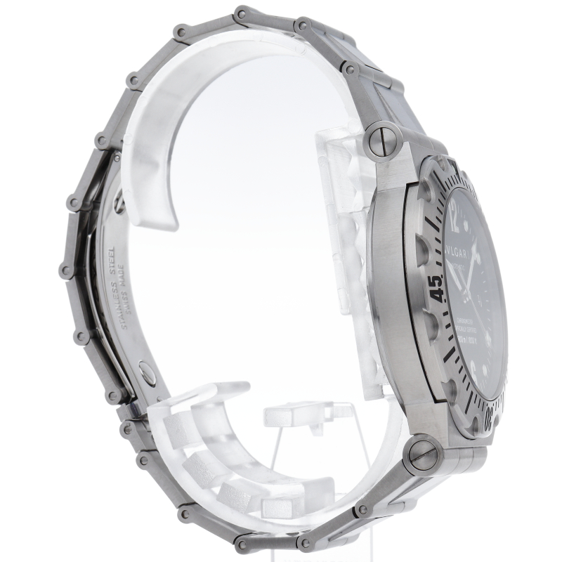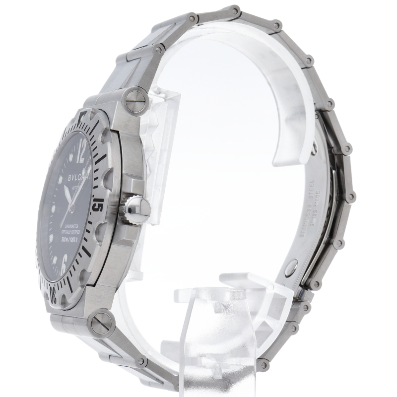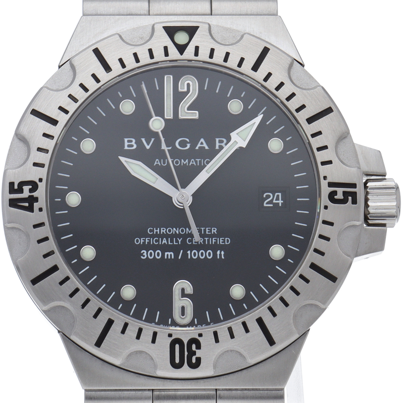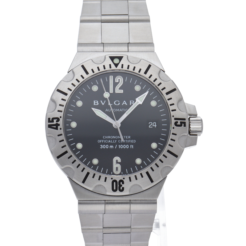 スポーツとエレガントなイメージを融合させたブルガリらしいスポーツモデルです。スポーツ系のモデルは実用性を前面に押し出して無骨になりがちですが、ダイバーウォッチでありながらフォーマルな装いにも合わせられるデザイン性の高さは流石です。SD40S/SD40SSDAUTO。