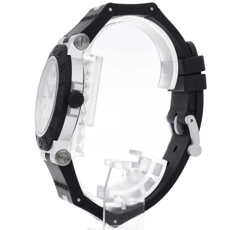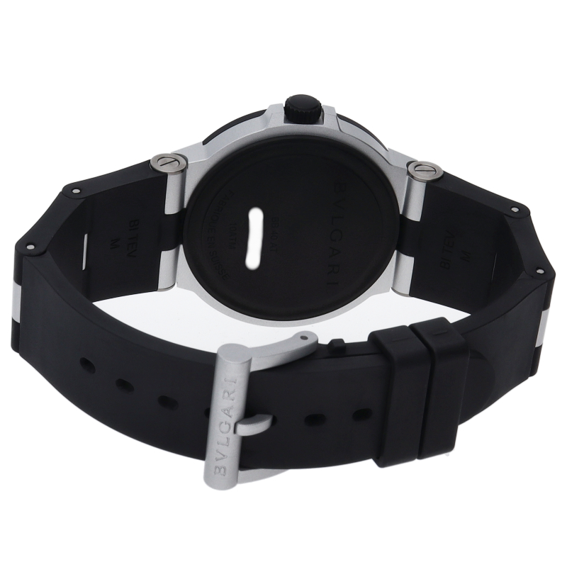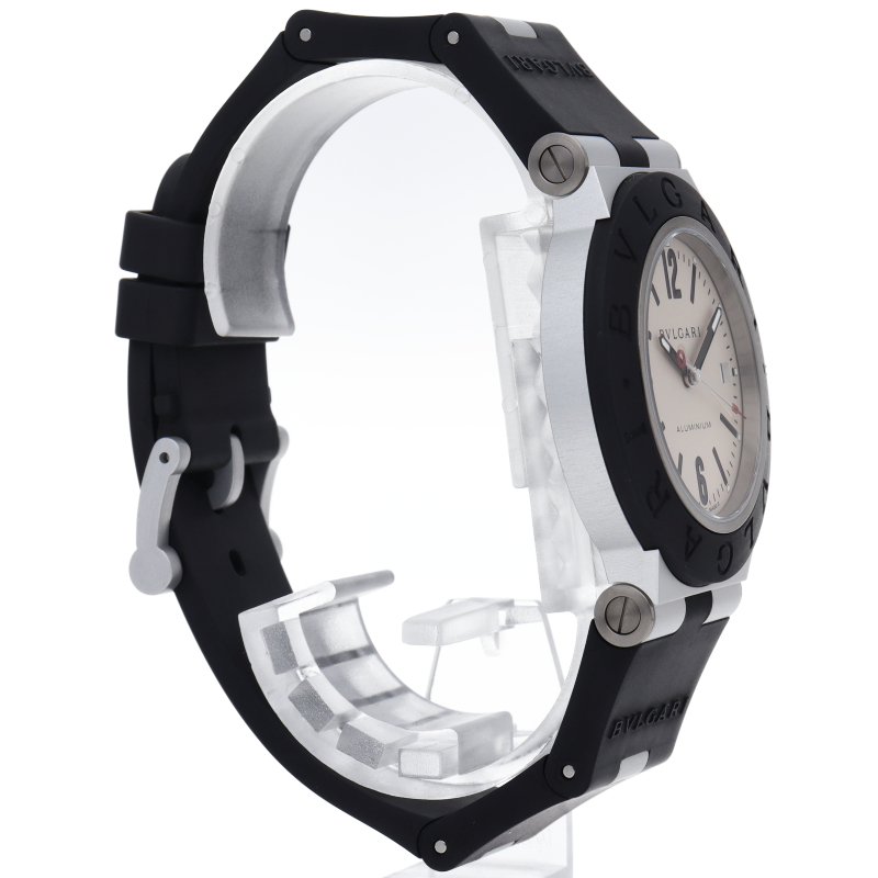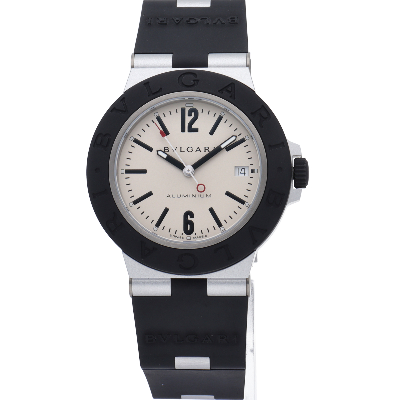 ブルガリの人気シリーズでスポーティーな「アルミニウム」。異素材であるアルミニウムとラバーをうまく組み合わせた個性的でブルガリらしい革新的な1本。