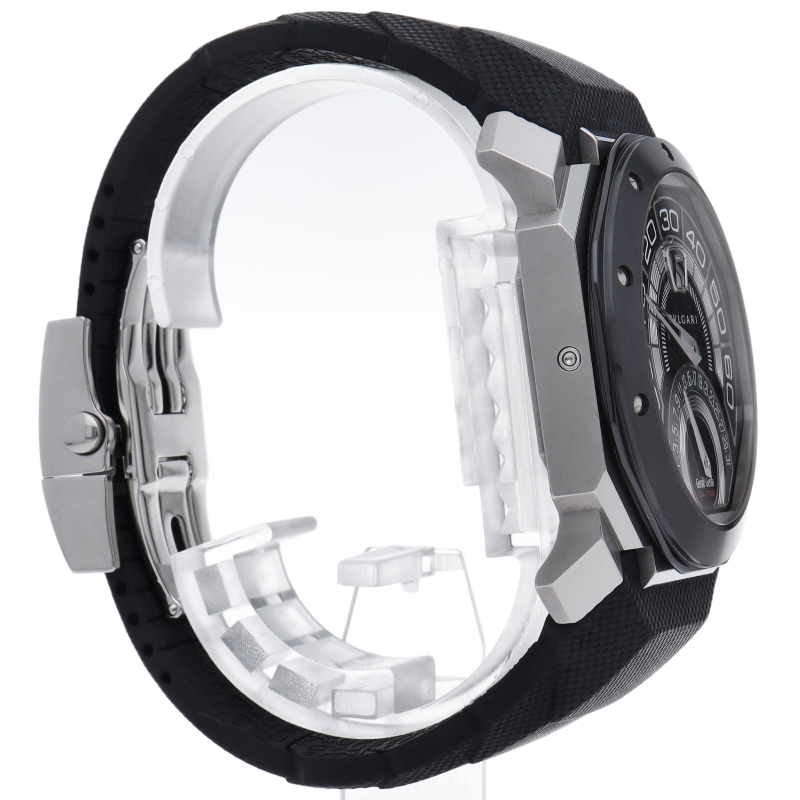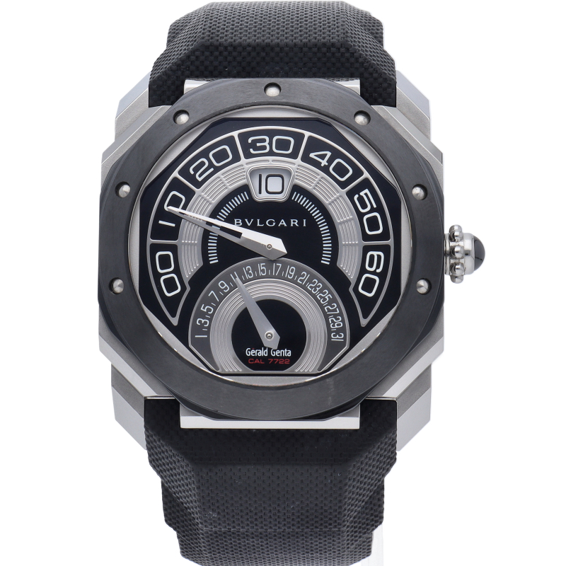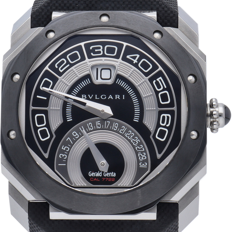2010年にブルガリの傘下になったジェラルド・ジェンタの手掛けたファーストモデル、オクト バイレトロ ジェラルド・ジェンタ。6時位置にはしっかりと「Gerald Genta」のロゴ見られます。12時位置のジャンピングアワーの時間表示とレトログラードで楽しませる分表示は、デザイン性とインパクトを融合させた大胆な仕上がりとなっております。OBR.Y.1C/BGO43BSCVDBR。