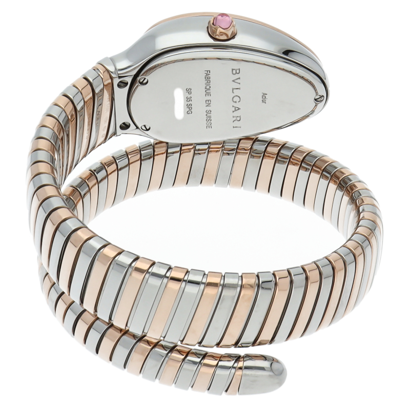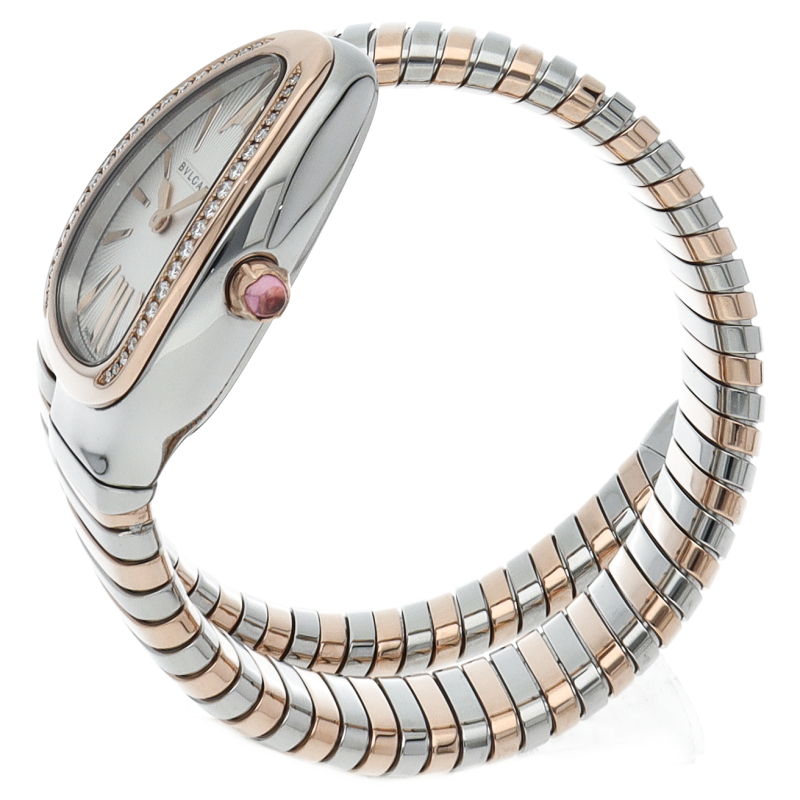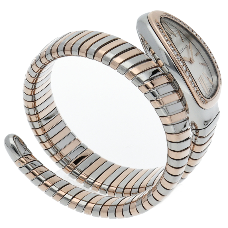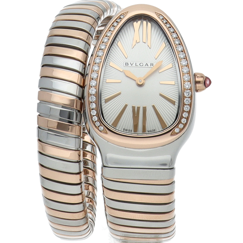 ブルガリのデザインが誇るもっとも象徴的なシンボルの2つを融合させたセルペンティ トゥボガス ウォッチ。イタリア語で蛇を意味するセルペンティという名の通り、蛇のように手首に巻きつくように装着します。 アクセサリー的な要素の強いブルガリの時計はそのデザイン性が高く評価されています。102237/SP35SPG