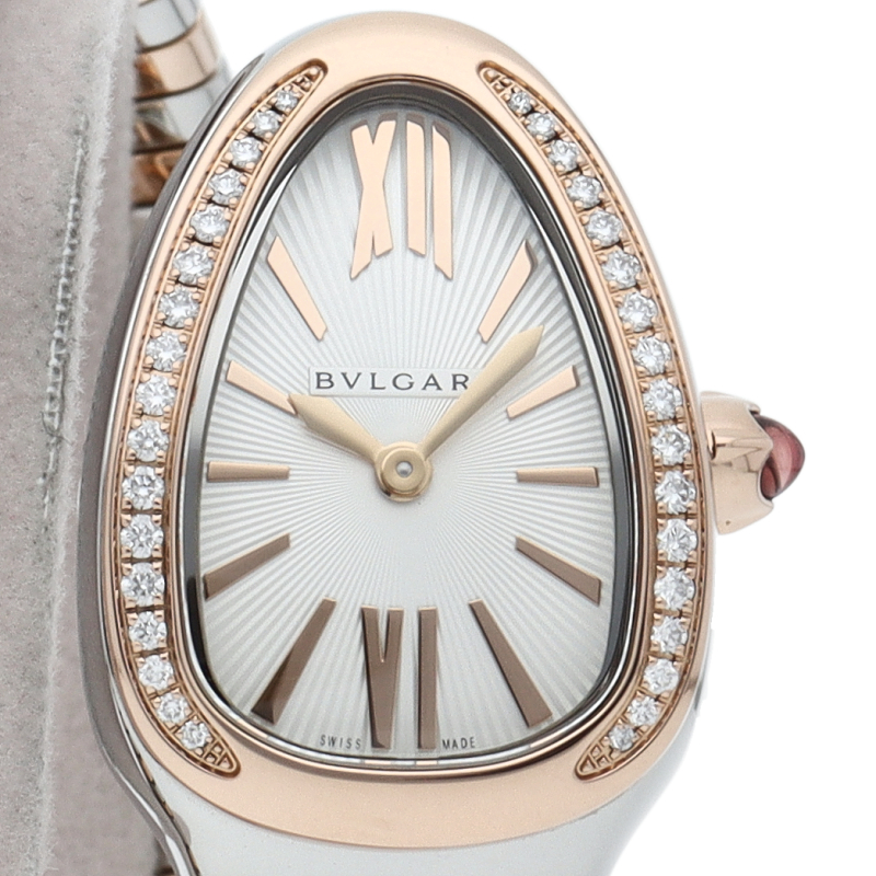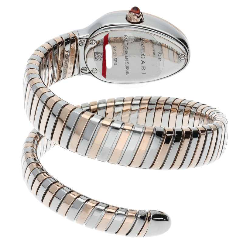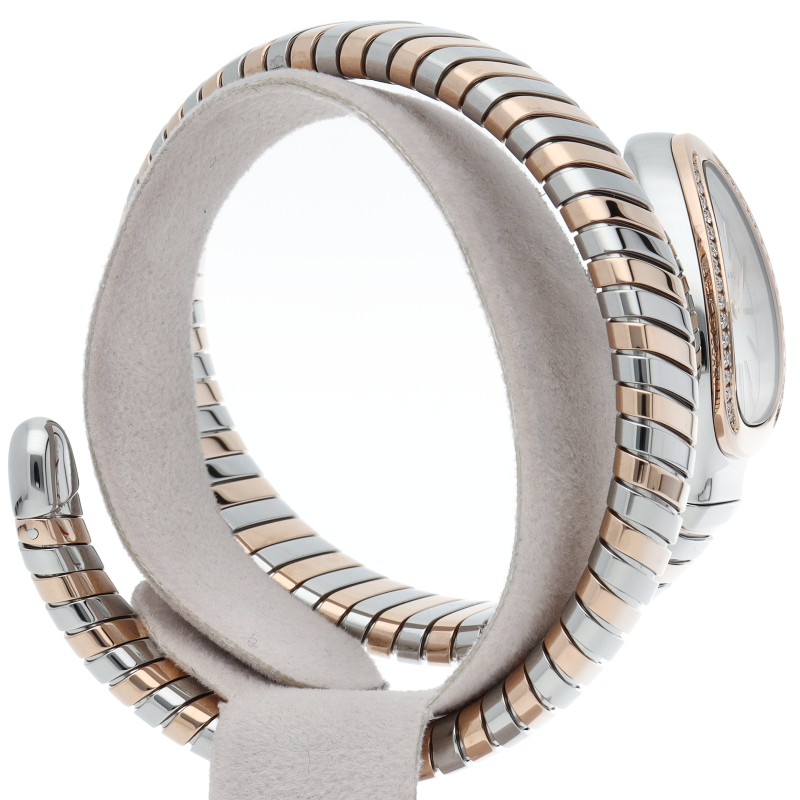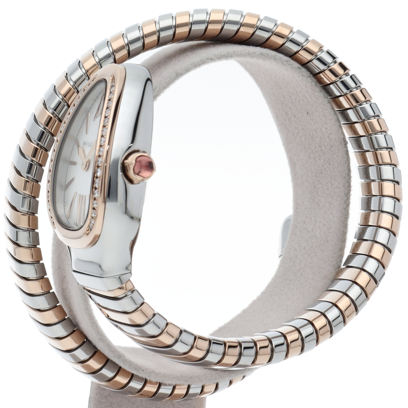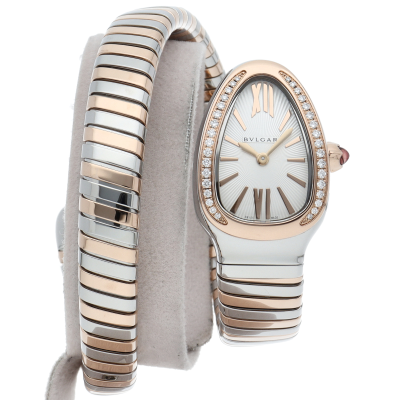 ブルガリのデザインが誇るもっとも象徴的なシンボルの2つを融合させたセルペンティ トゥボガス ウォッチ。イタリア語で蛇を意味するセルペンティという名の通り、蛇のように手首に巻きつくように装着します。 アクセサリー的な要素の強いブルガリの時計はそのデザイン性が高く評価されています。SP27SPG/103131。
