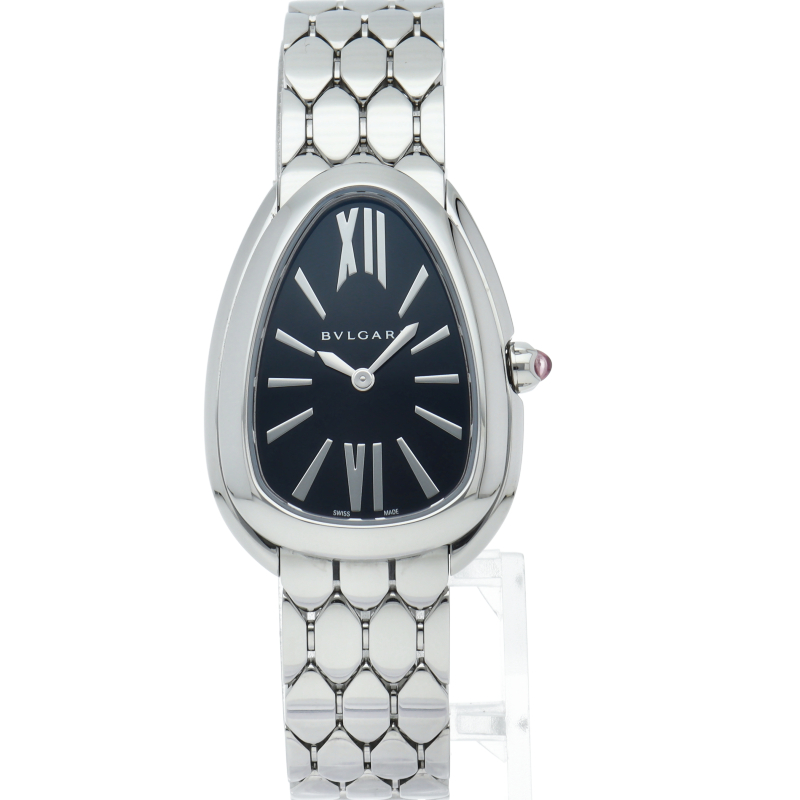 素材の放つ端正な輝きが魅力のセルペンティ セドゥットーリ ウォッチ。抗いがたいミステリアスな官能性とコンテンポラリーな魅力を見事にブレンドしています。 ブラックのラッカー仕上げのダイアルを配した個性的なドロップ型のウォッチ。魅惑的なコントラストが特徴です。