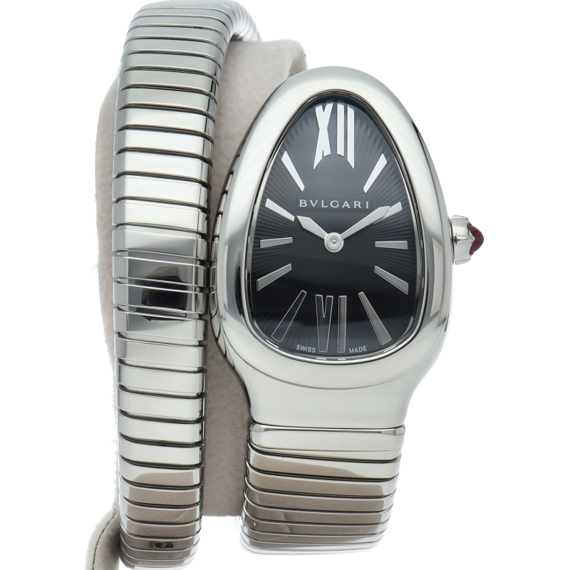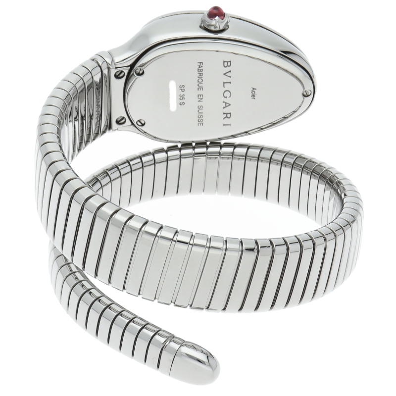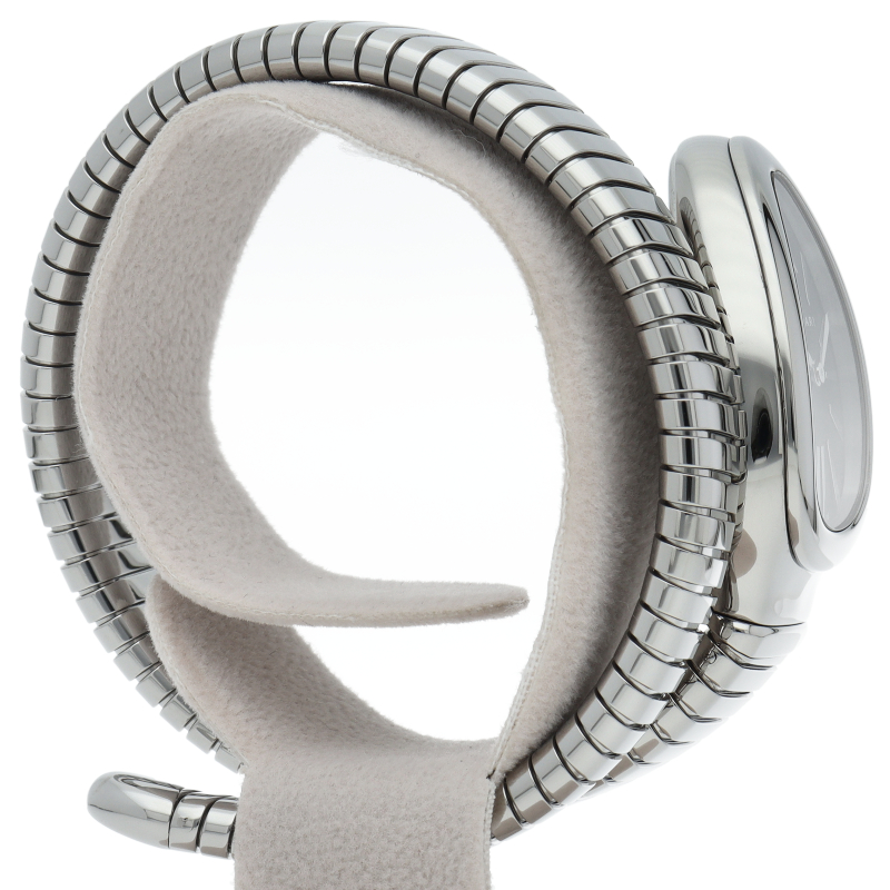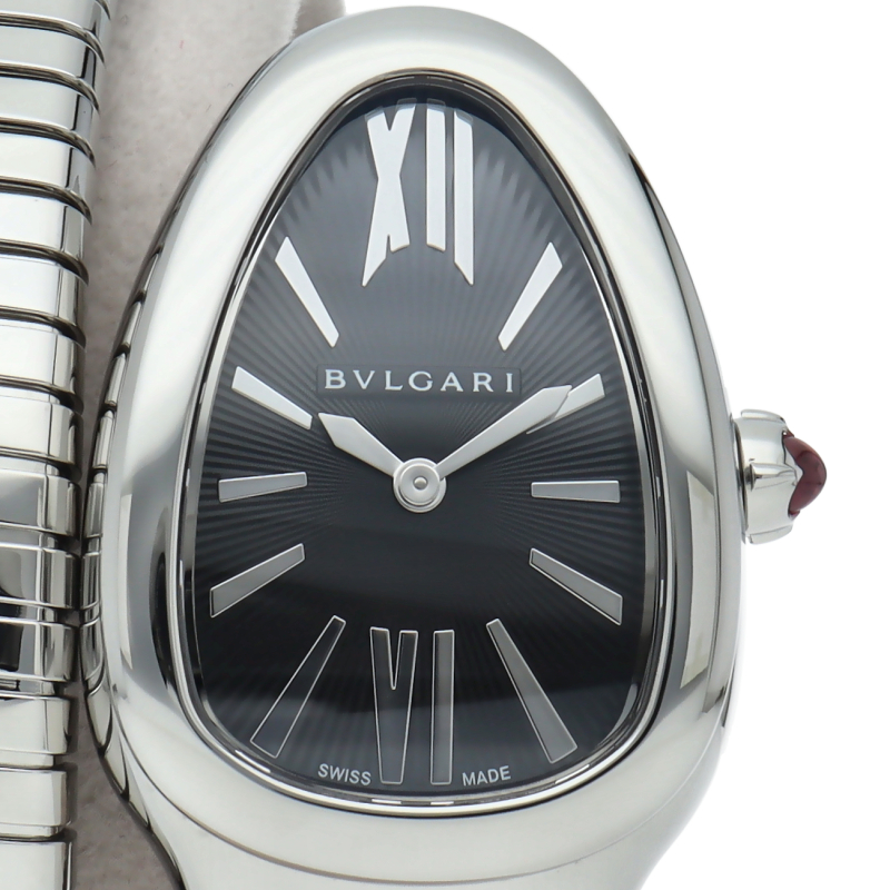 ブルガリのデザインが誇るもっとも象徴的なシンボルの2つを融合させたセルペンティ トゥボガス ウォッチ。イタリア語で蛇を意味するセルペンティという名の通り、蛇のように手首に巻きつくように装着します。 アクセサリー的な要素の強いブルガリの時計はそのデザイン性が高く評価されています。SP35S/102824