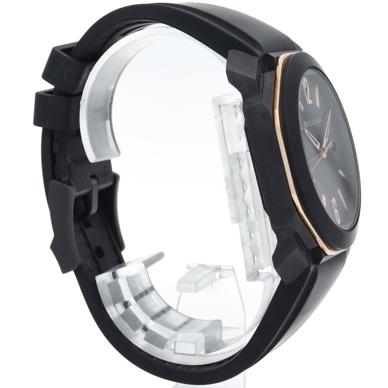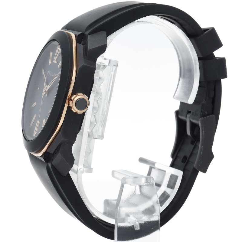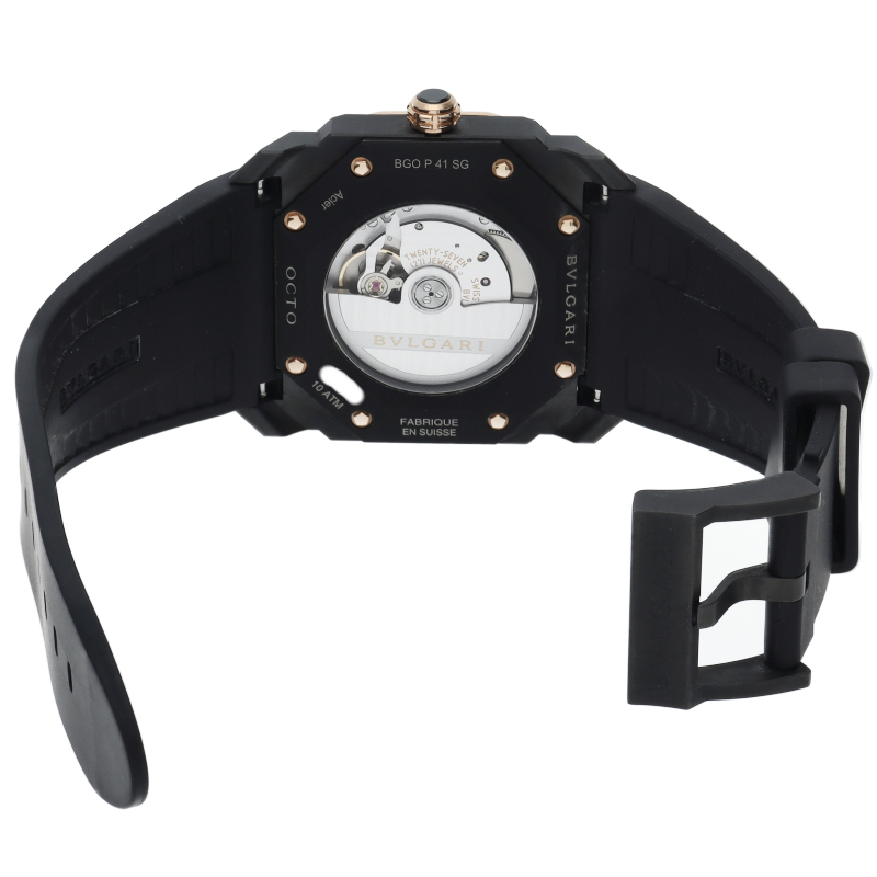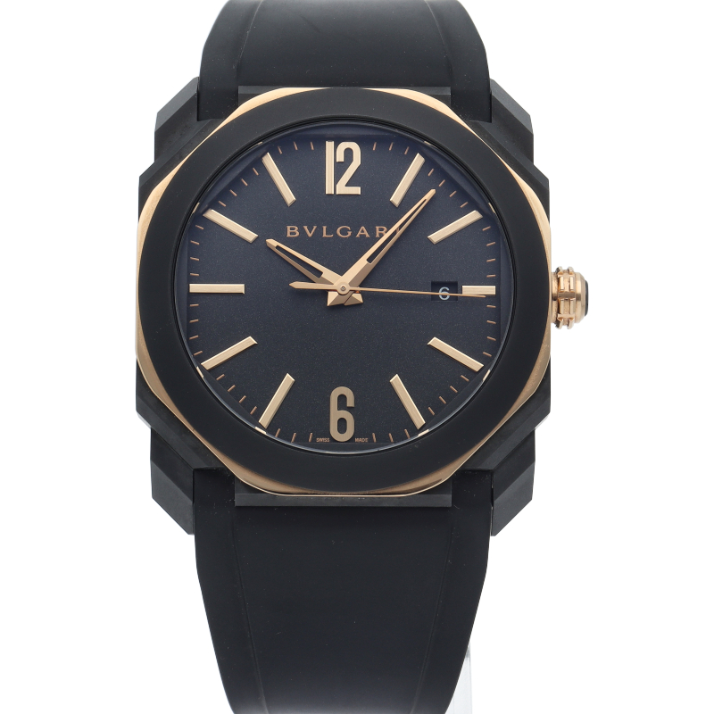 オクトラインの原点とそのデザインの真髄を象徴する、複雑な110面ケースを備えた構造にこだわったウォッチ。ブラックDLC仕上げにラグジュアリーなピンクゴールドのディテールを組み合わせたスタイリッシュなタイムピースです。現代的な素材の強靭さと構造的な外観が力強い印象を与えます。103085/BGOP41SG。