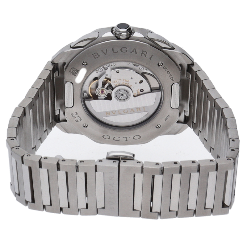 ラテン語で「8」を意味するオクトは、ローマの古代建築に着想を得たオクタゴン(八角形)ケースとラウンドベゼルを調和させたブルガリのハイクラスモデル。その大胆でありながらも繊細なフォルムは、何世紀にも亘って培われてきた不朽の価値を教えてくれます。OC42SCH/103471