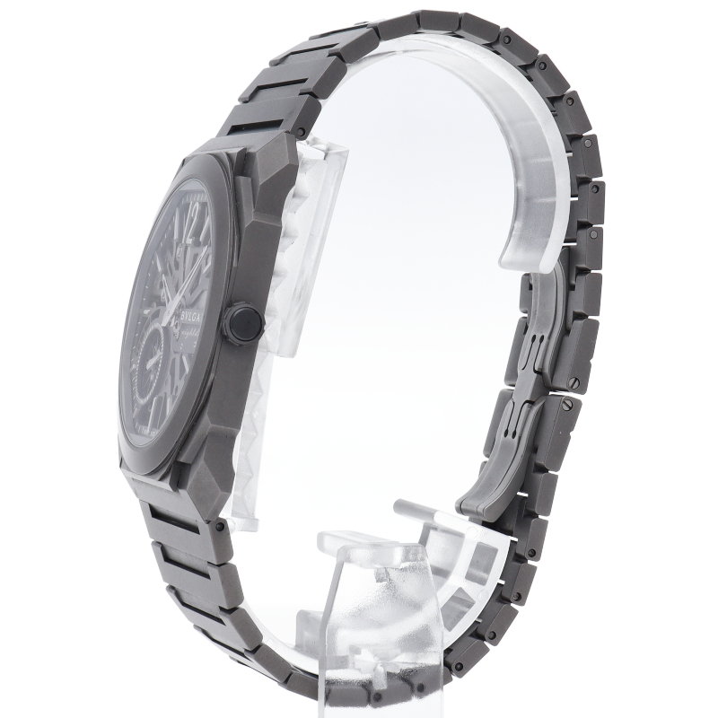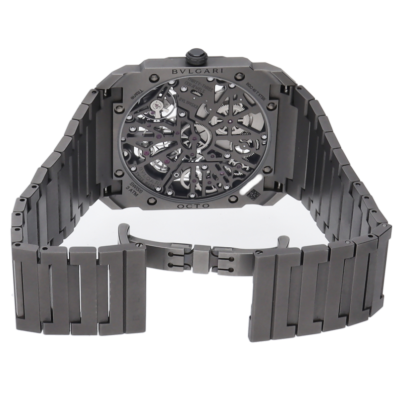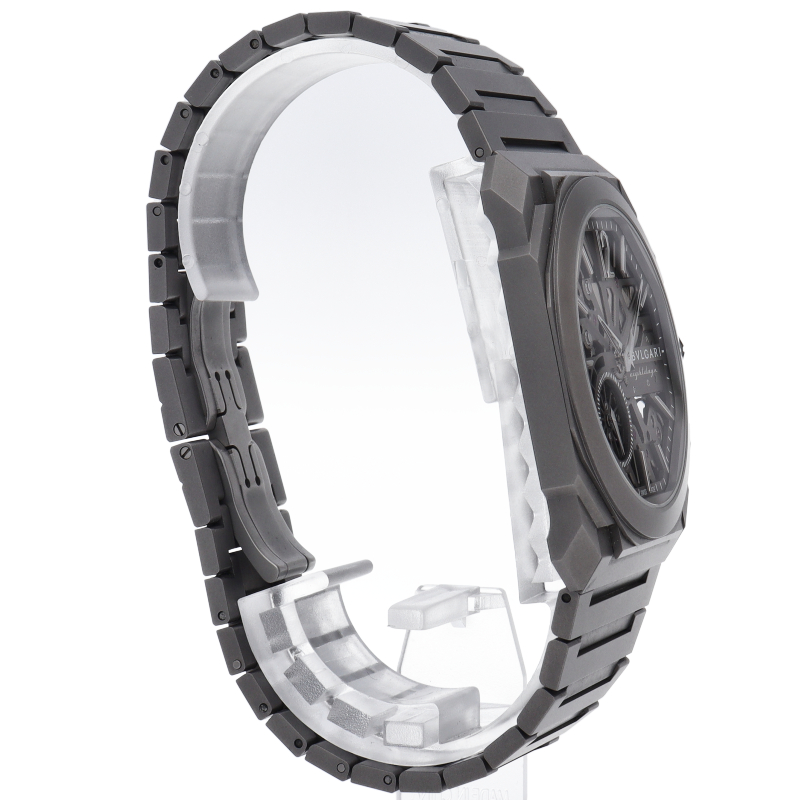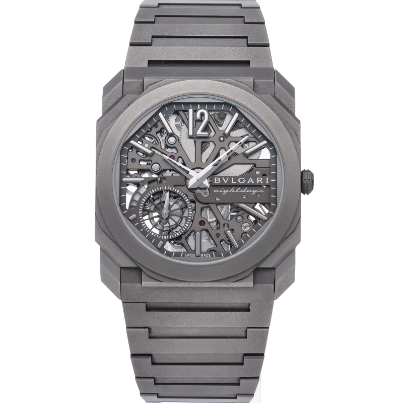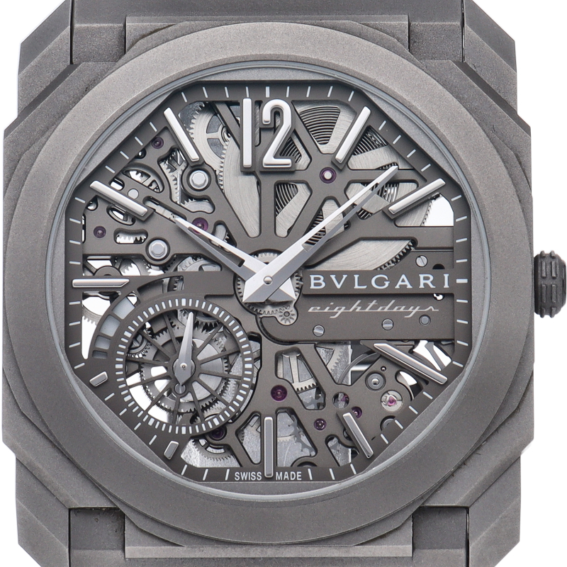 21世紀の真の象徴とも言えるオクト フィニッシモ オートマティック ウォッチ。チタン製のパワフルでモダンなモノトーンのルックにスケルトン加工のダイアルを合わせて、完璧な視認性を実現しています。 8日間という圧倒的なパワーリザーブを備えたタイムピースです。