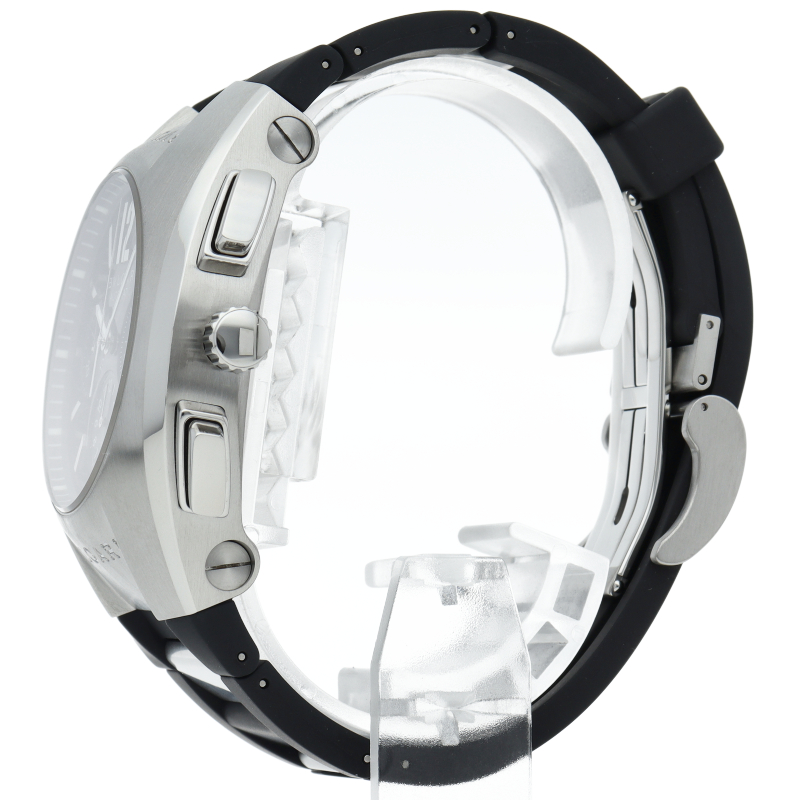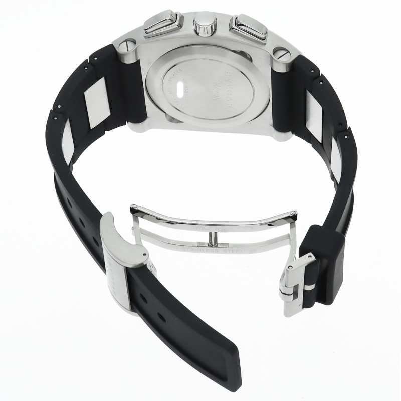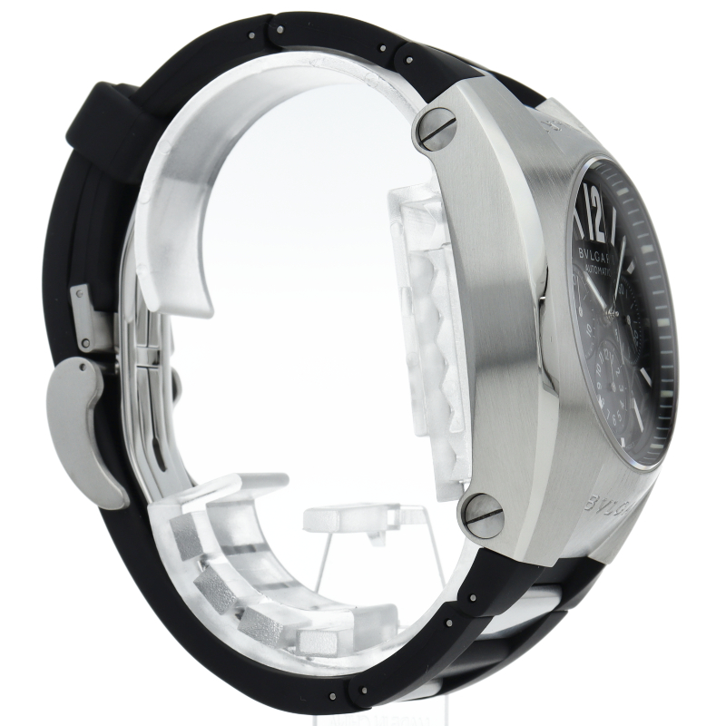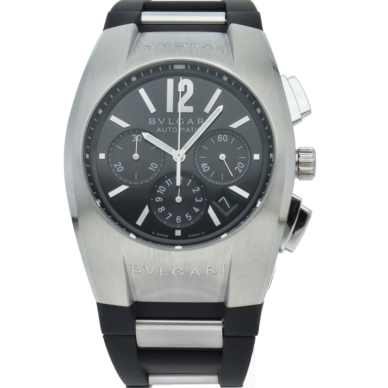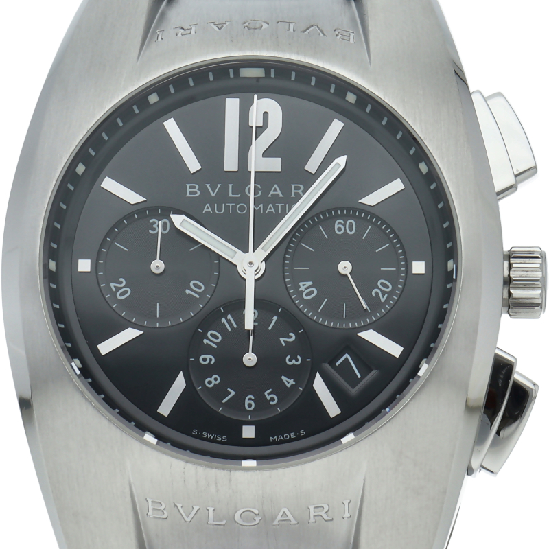 ブルガリの独特なデザインが個性的な「エルゴン40」。こちらはクロノグラフ・デイト表示も搭載した実用的にも優れた1本です。EG40SCH/EG40BSLDCH。